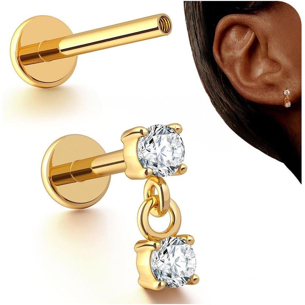 BodyBonita 16G Stud Earrings Flat Back – G23 Titanium Internal Thread Cartilage Earrings for Women Hypoallergenic CZ Stud Piercing Jewelry Tragus/Nose/Helix/Conch/Medusa/Lip/Labret 6mm 8mm(Dangle CZ-14K Gold)