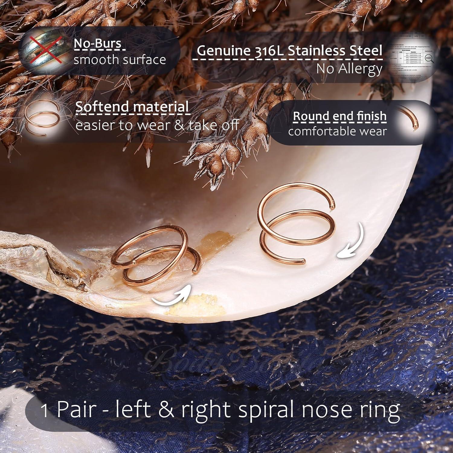 BodyBonita 2-8Pcs Softened 316L Stainless Steel Double Hoop Nose Ring for Single Piercing 22G 20G 18G Bendable Twist Spiral Nose Rings Hoops for Women 8mm 10 mm(1 pair-Rose Gold)