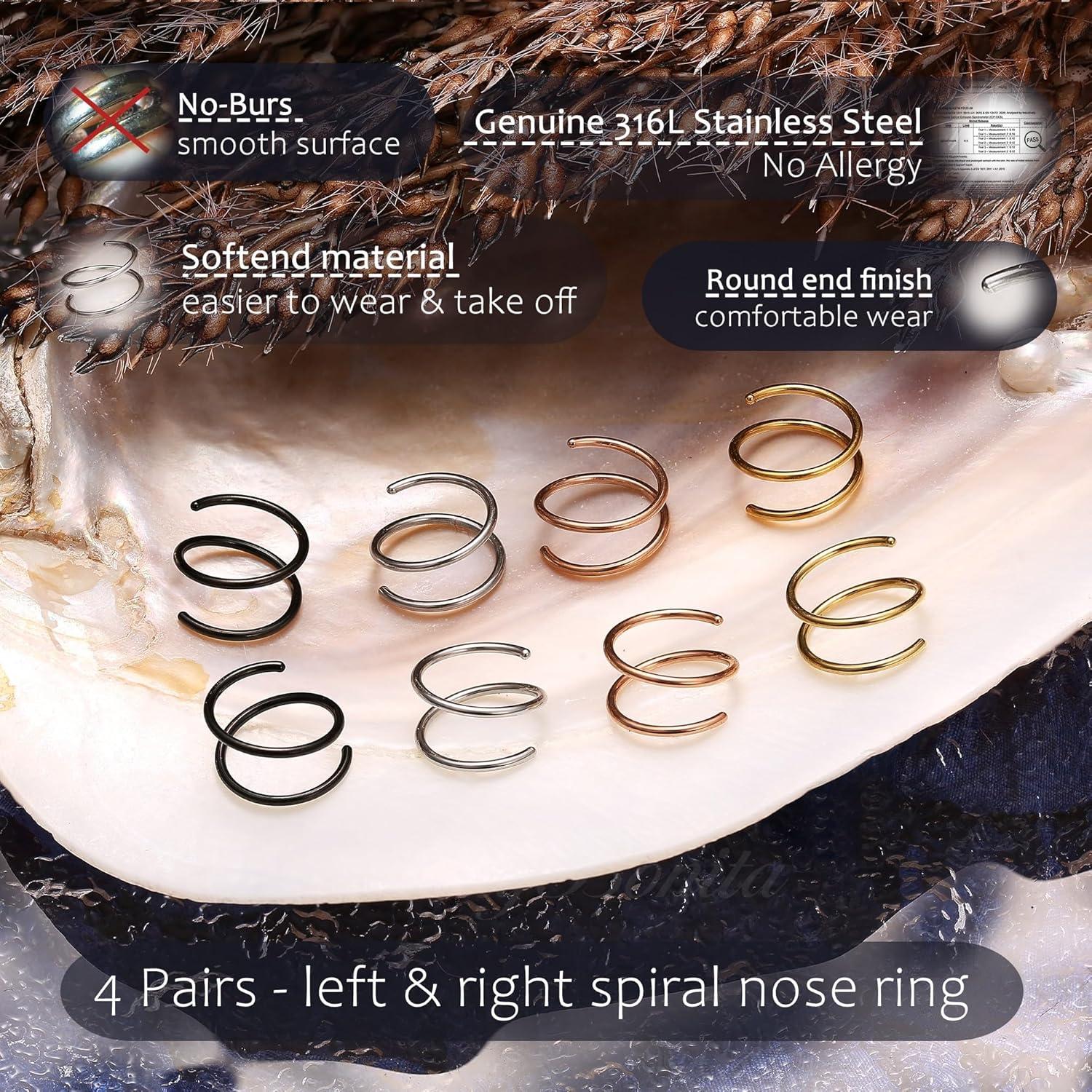 BodyBonita 2-8Pcs Softened 316L Stainless Steel Double Hoop Nose Ring for Single Piercing 22G 20G 18G Bendable Twist Spiral Nose Rings Hoops for Women 8mm 10 mm(4 pairs-Mixed)