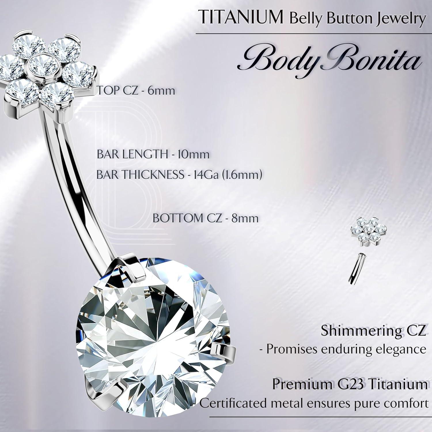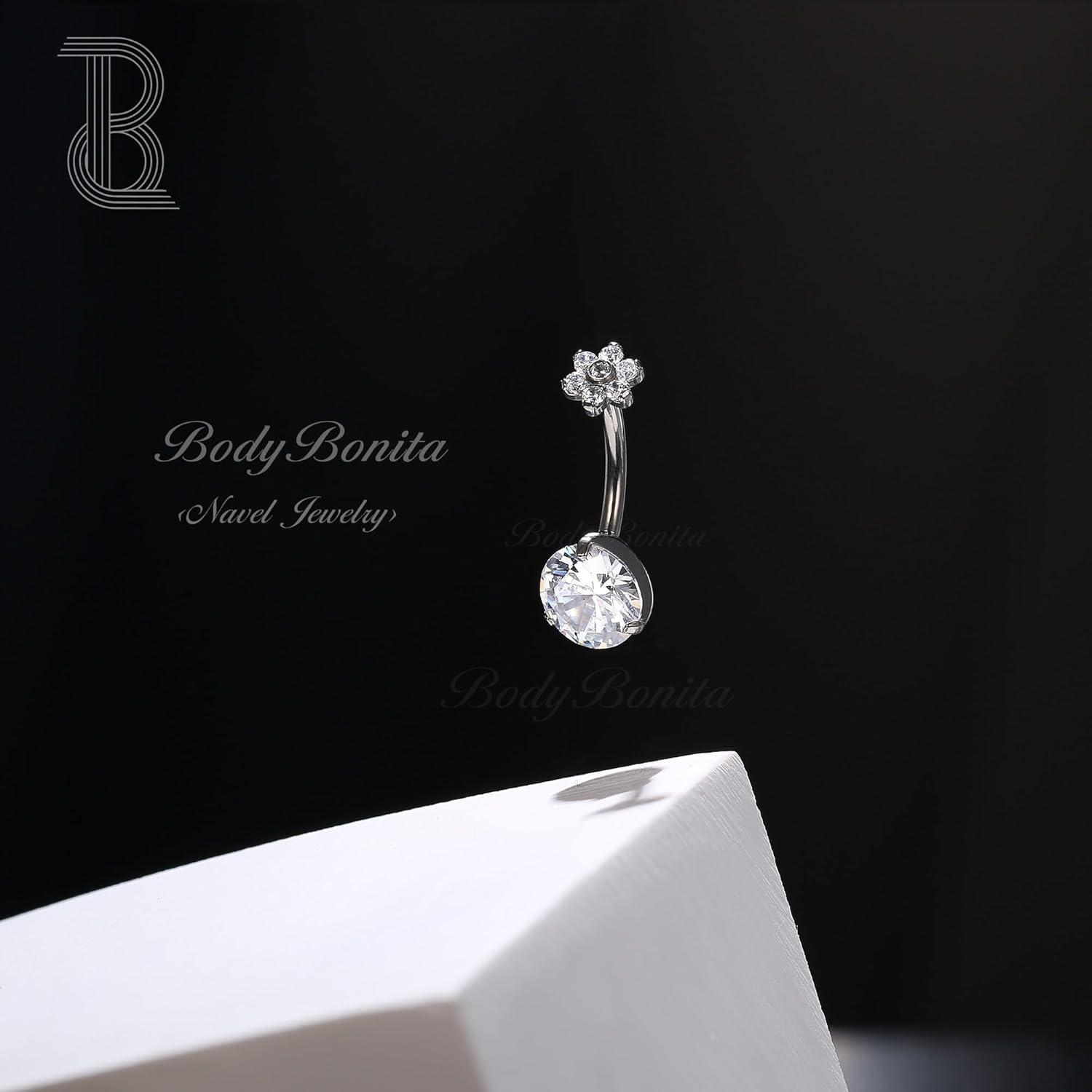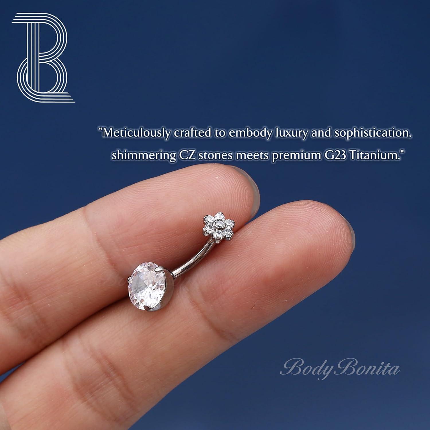 BodyBonita G23 Titanium Belly Button Rings – 14G Internally Threaded 14mm Belly Ring Round Square Star Teardrop CZ Navel Rings for Women(Flower)