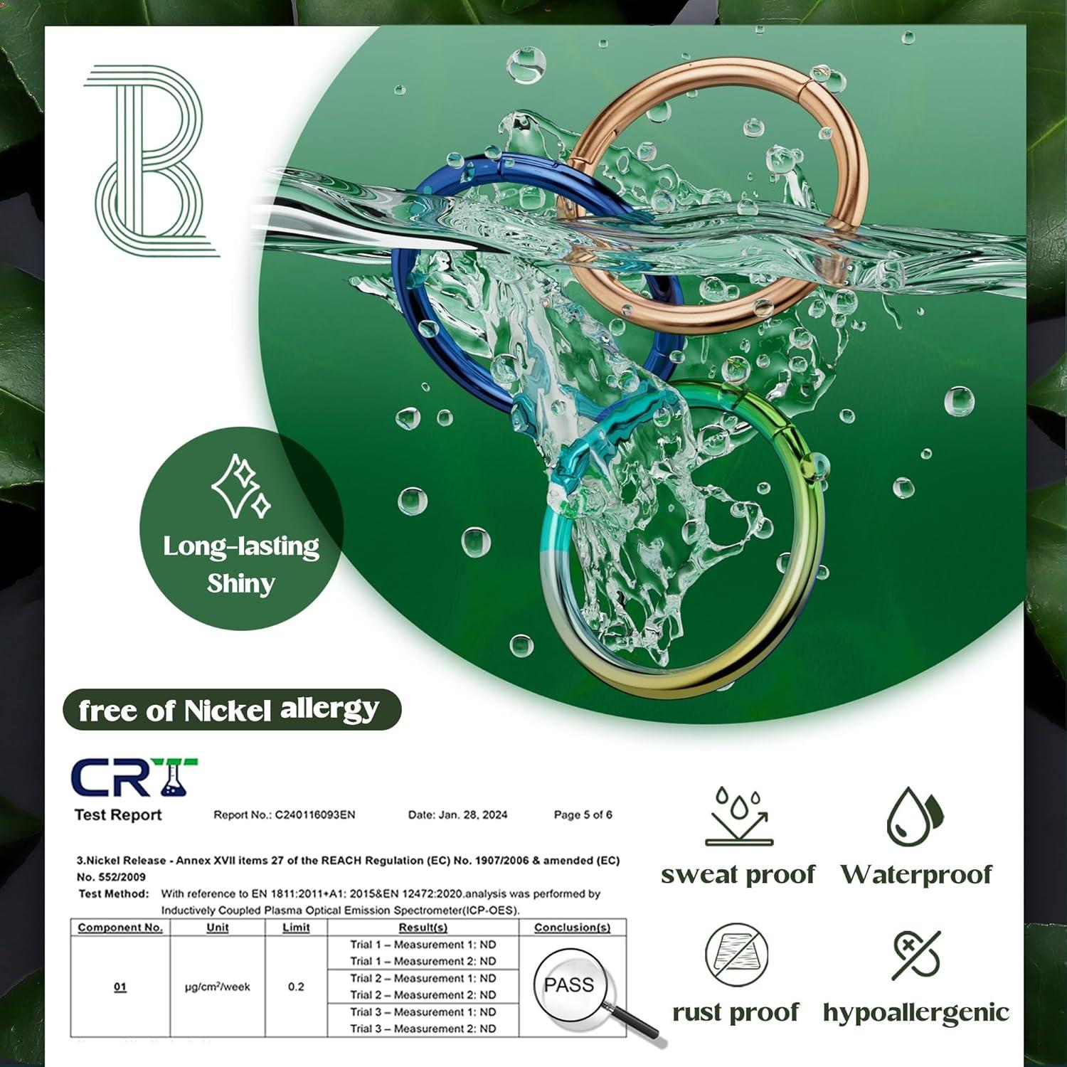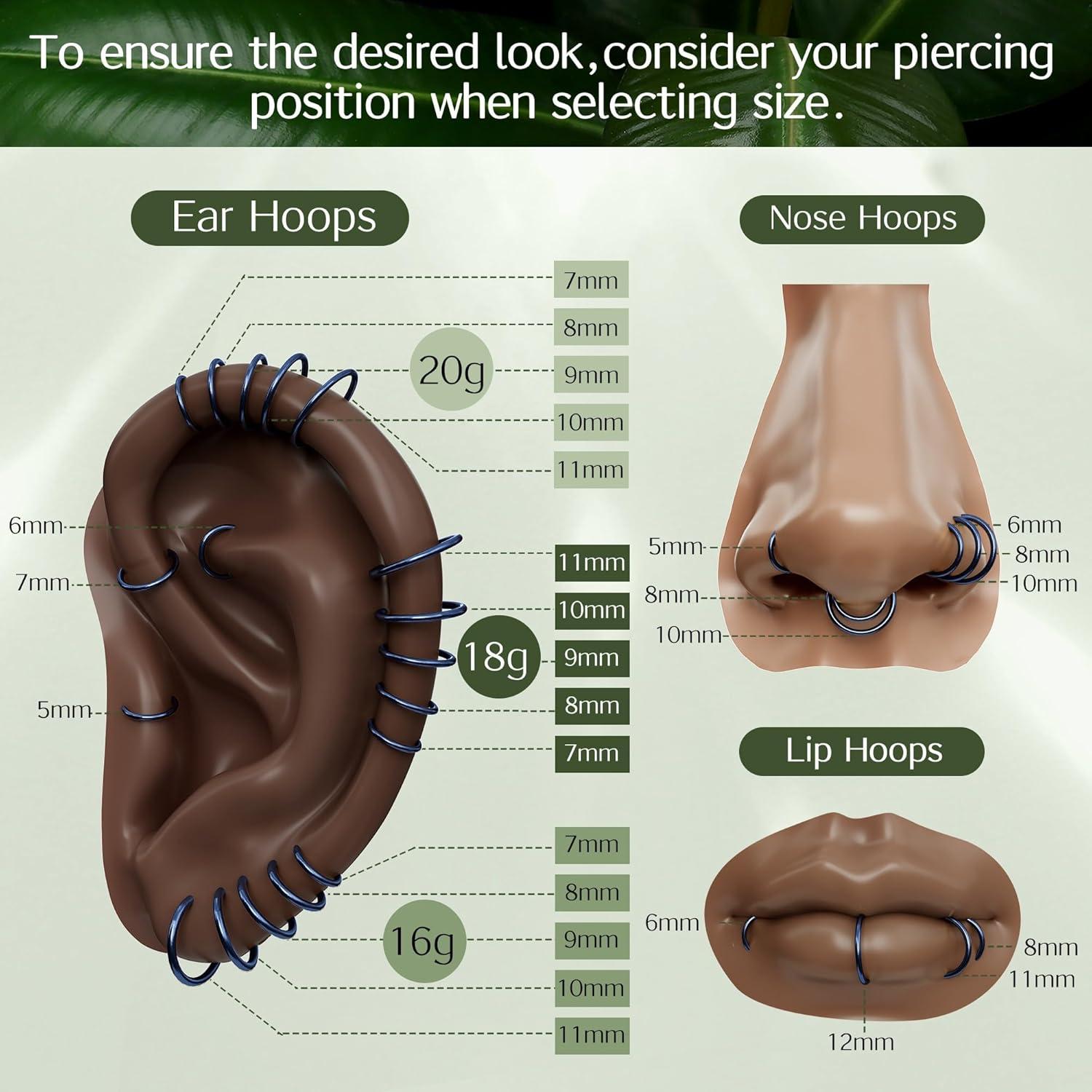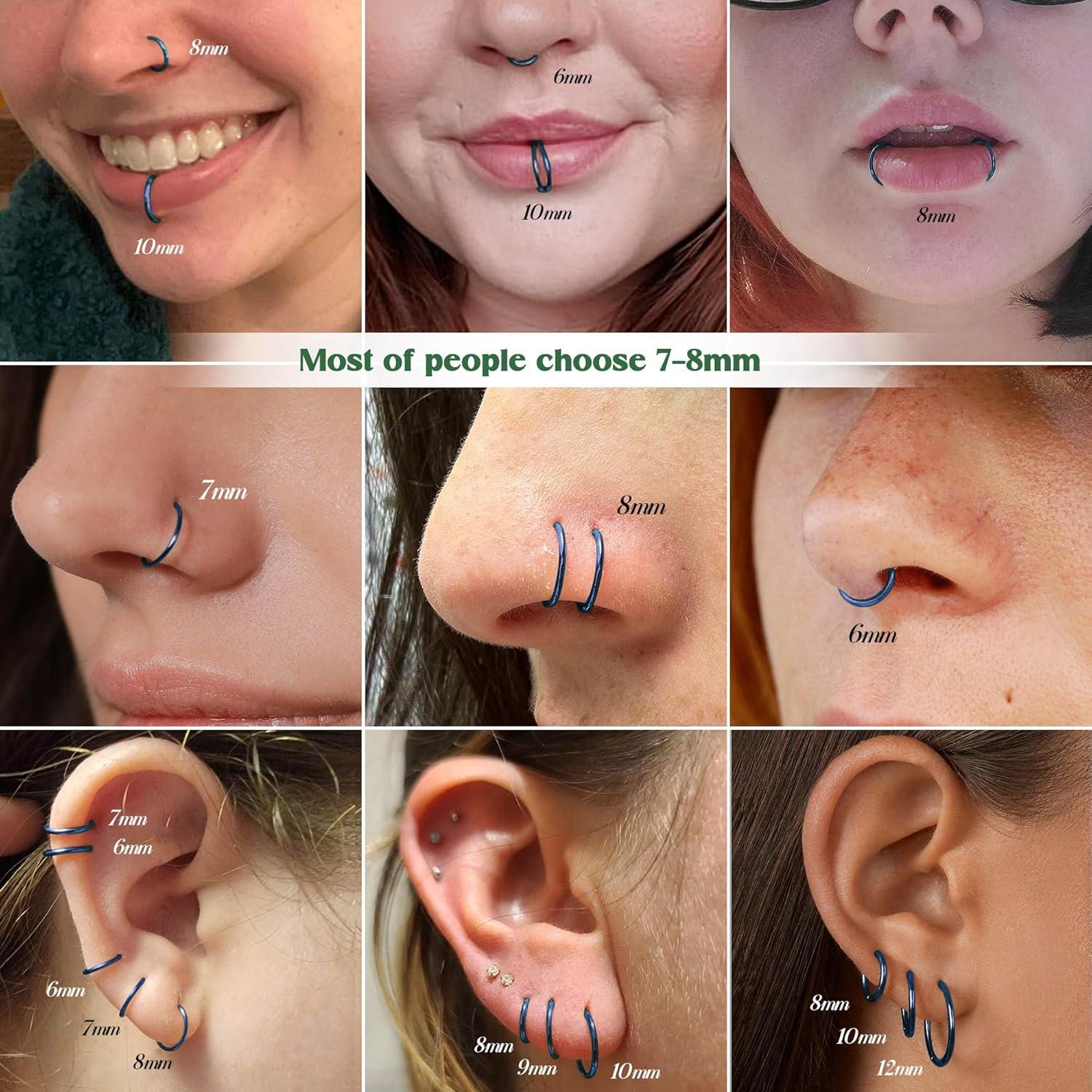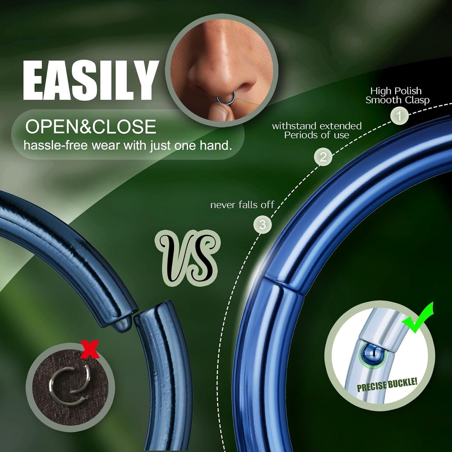 BodyBonita Hinged Nose Rings Hoops – 316L Surgical Steel Nose Piercing Jewelry Septum Clicker Lip Rings Cartilage Helix Daith Conch Tragus Rook Gold Plated/Silver/Black/Rose Gold Plated/Blue/Rainbow(Blue)