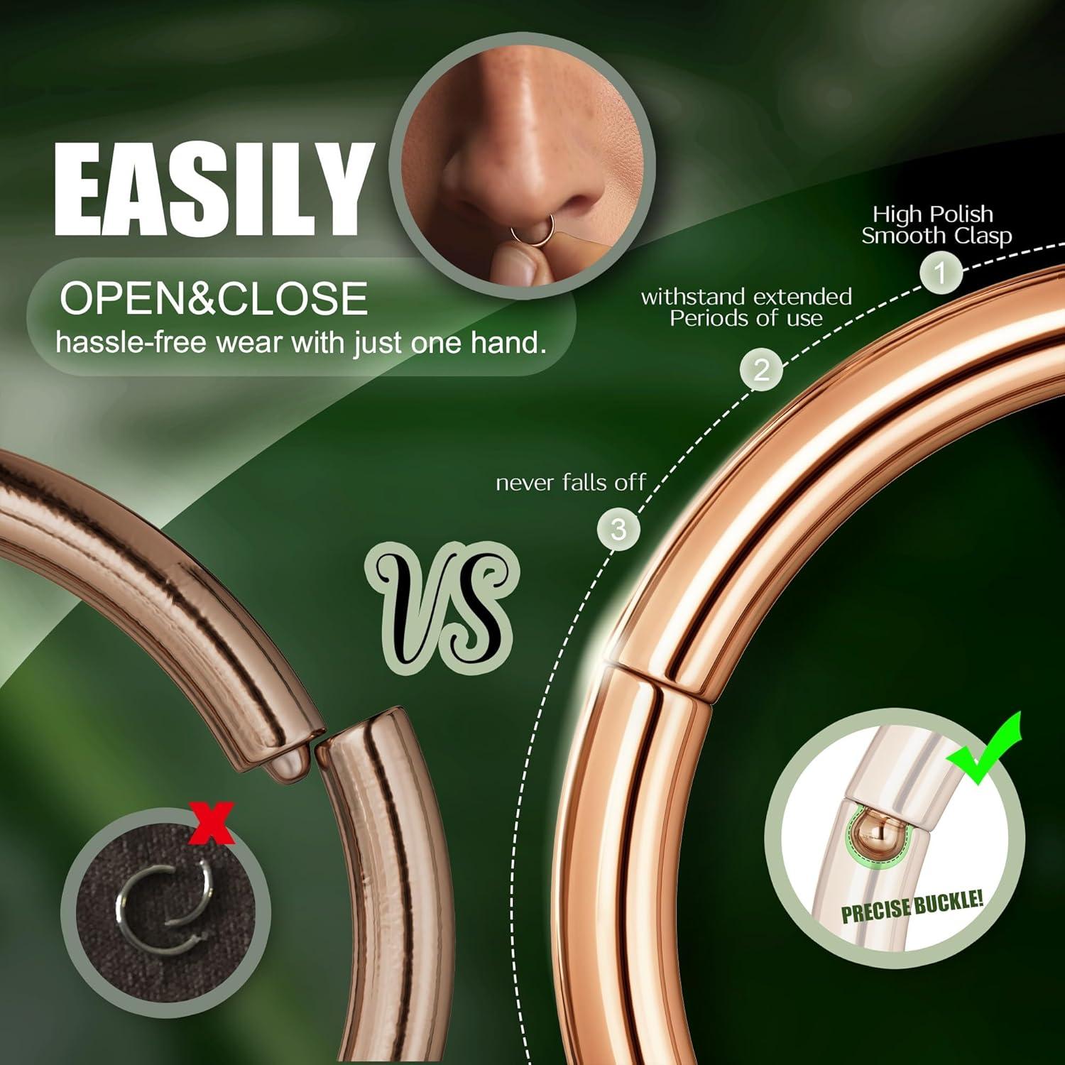 BodyBonita Hinged Nose Rings Hoops – 316L Surgical Steel Nose Piercing Jewelry Septum Clicker Lip Rings Cartilage Helix Daith Conch Tragus Rook Gold Plated/Silver/Black/Rose Gold Plated/Blue/Rainbow(Rose gold)