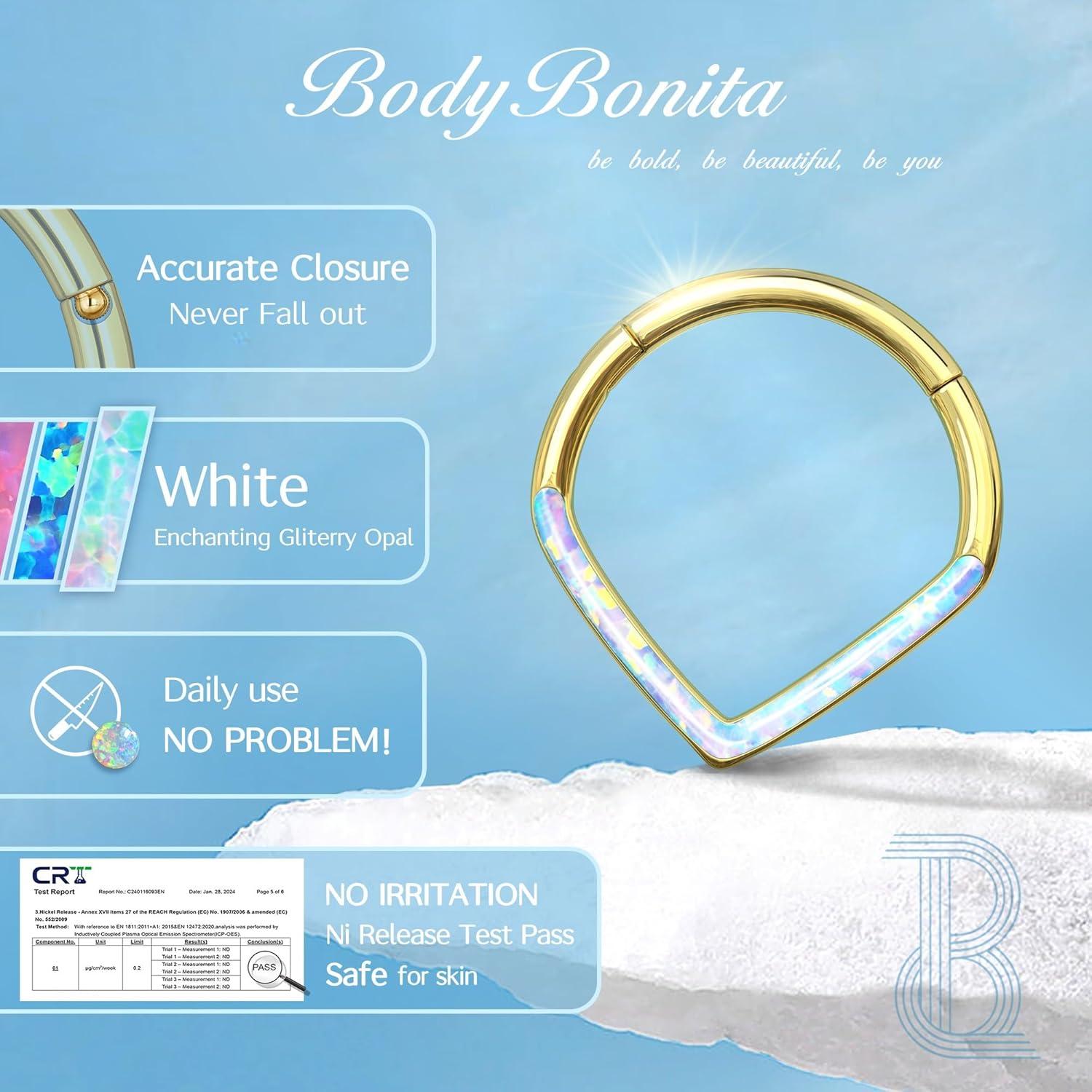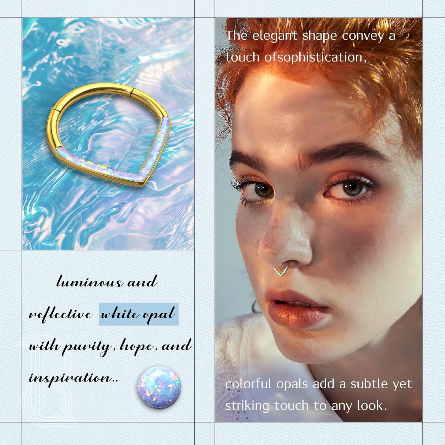 BodyBonita Opal 16G Septum Rings Teardrop – 316L Surgical Steel Hinged Nose Rings Hoops Septum Clicker Conch Helix Piercing Jewelry Daith Earring Pink/Blue/White Opal-10 mm/8 mm Silver/Gold Plated(White Opal 16G Gold)