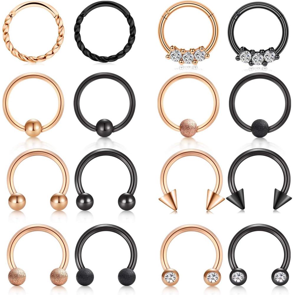 Incaton 16G Stainless Steel Nose Septum Rings Horseshoe Nose Rings Earring Cartilage Helix Tragus Earring Hoop Eyebrow Lip Hoop Retainer for Women Men 8mm 10mm 12mm (16pcs rose gold + black)
