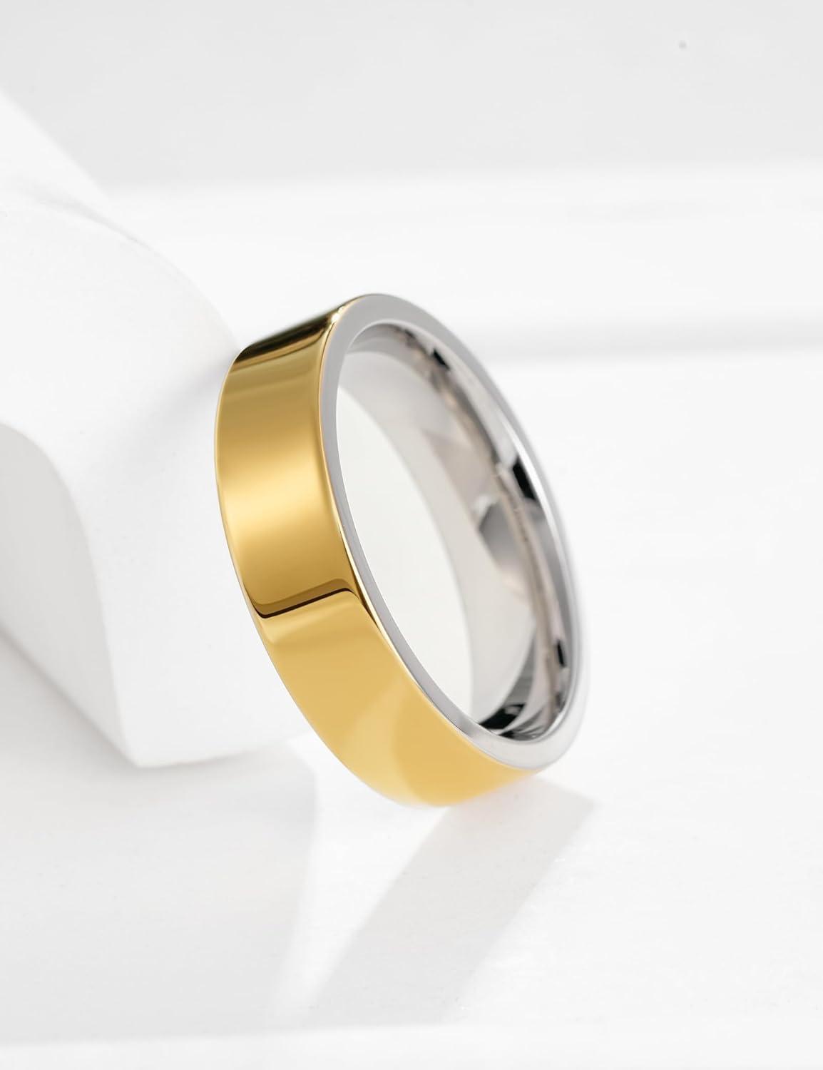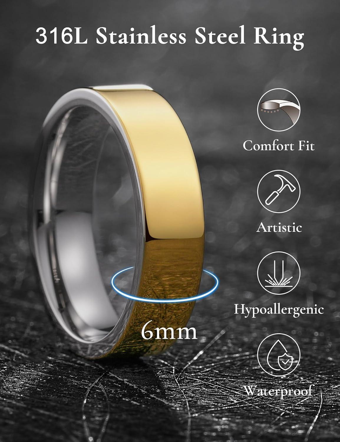 King Will 316L Stainless Steel Men’s Wedding Band – 6/8 mm Dual-Tone Wedding Ring Polished Finish with Gold/Black Steel Plating, Fashionable and Durable Stainless Steel Men’s Ring Size 7-14(Steel-Gold)