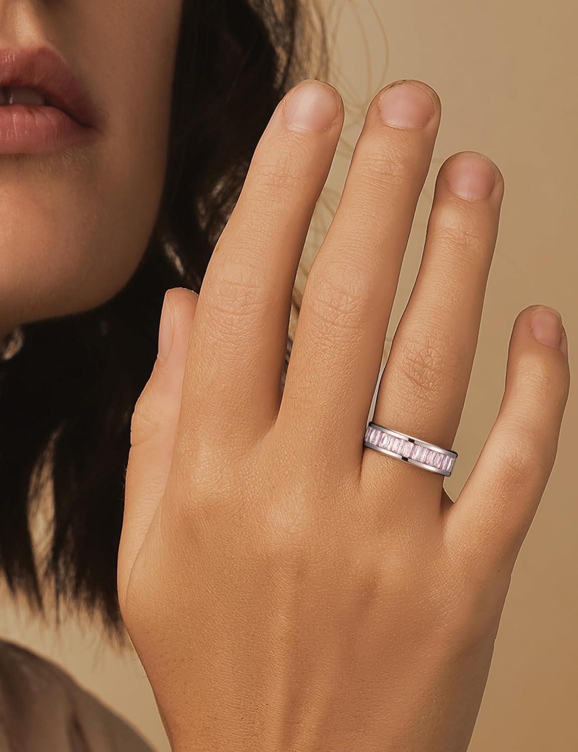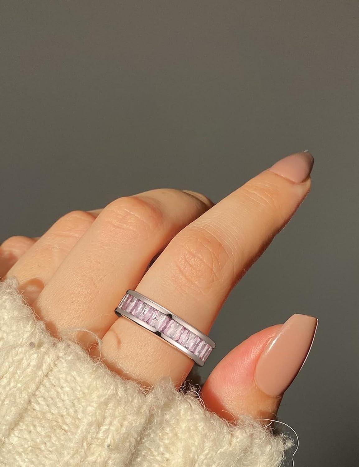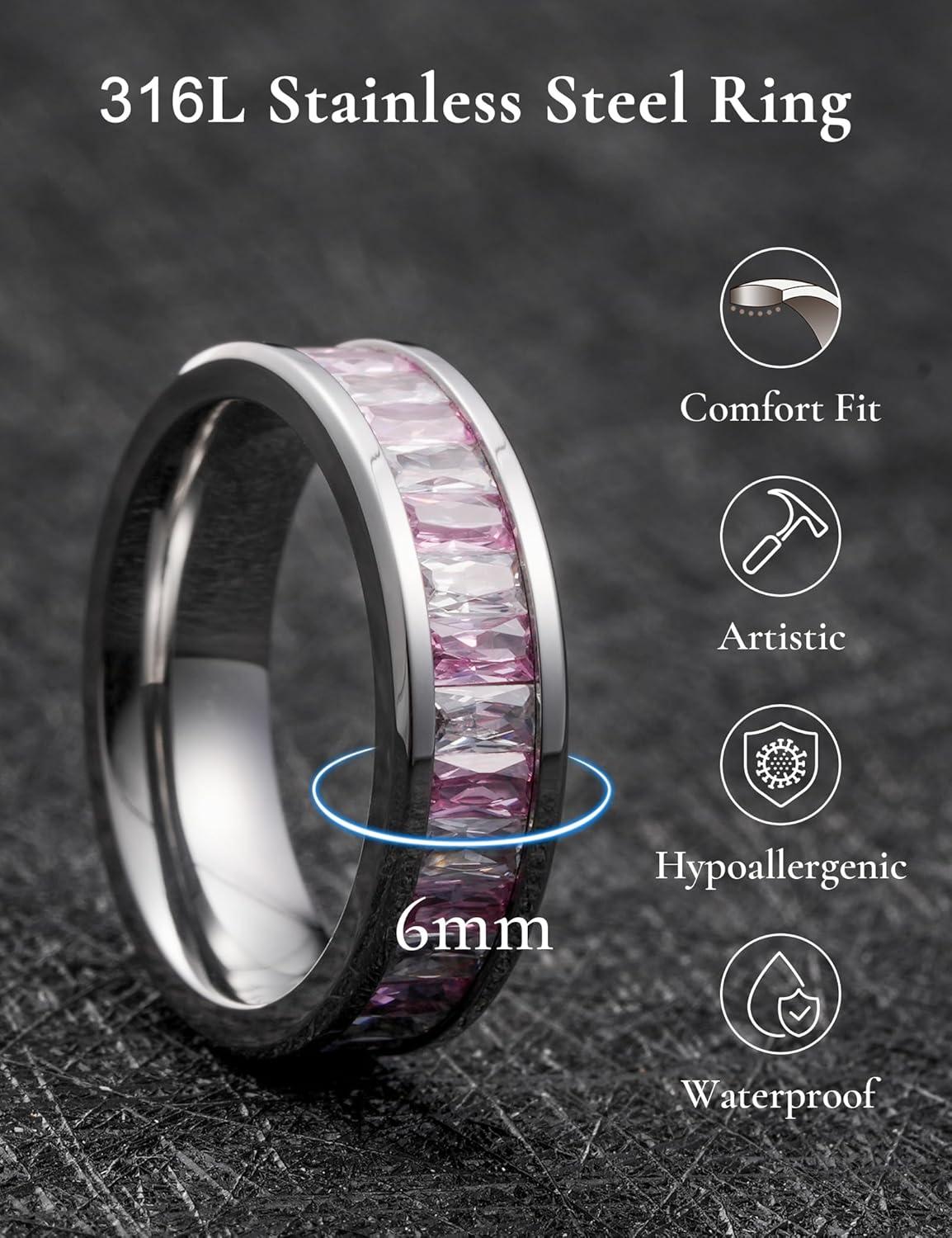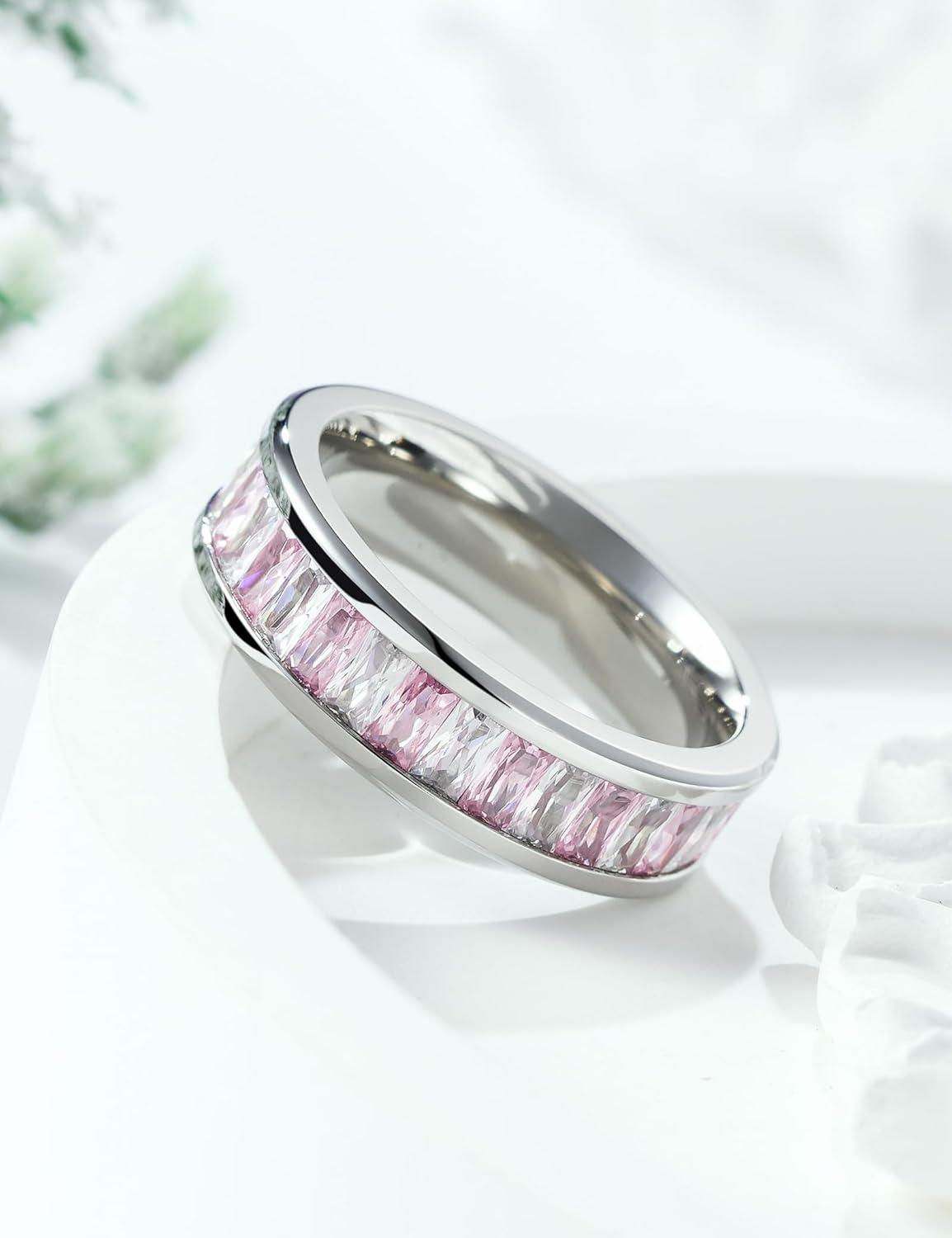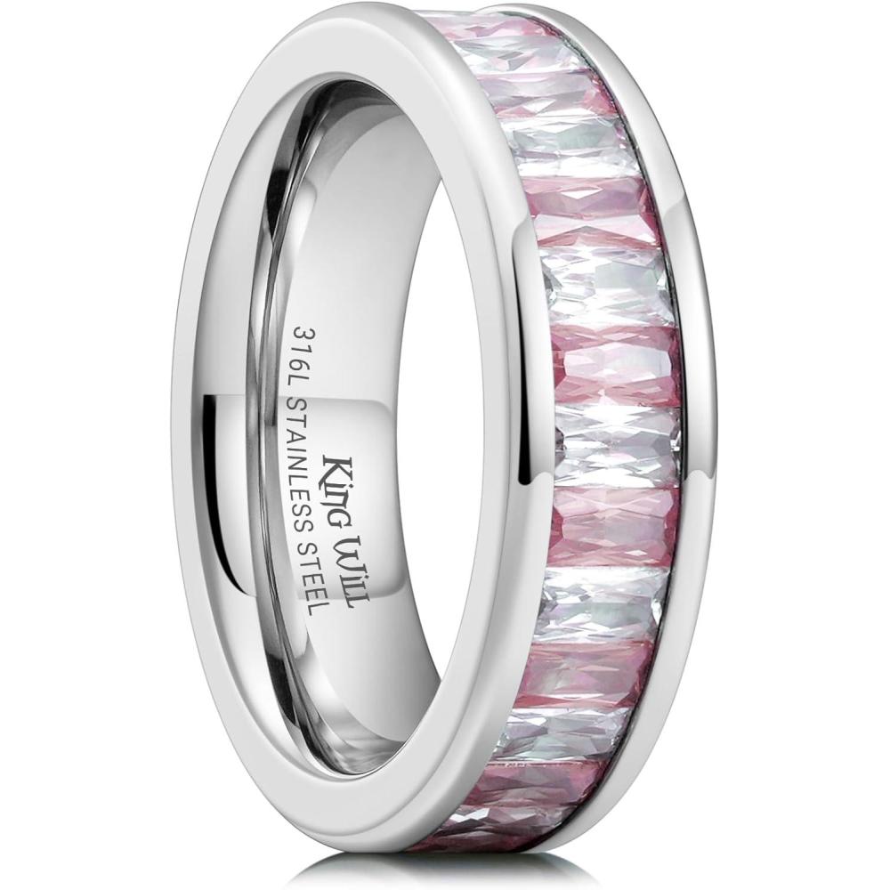 3. King Will 6mm Women Eternity Rings Colorful CZ Stackable Bands Polished Stainless Steel Anniversary Band Pipe Cut Engagement Ring Durable Comfort Fit Size 6-10(Pink&White)