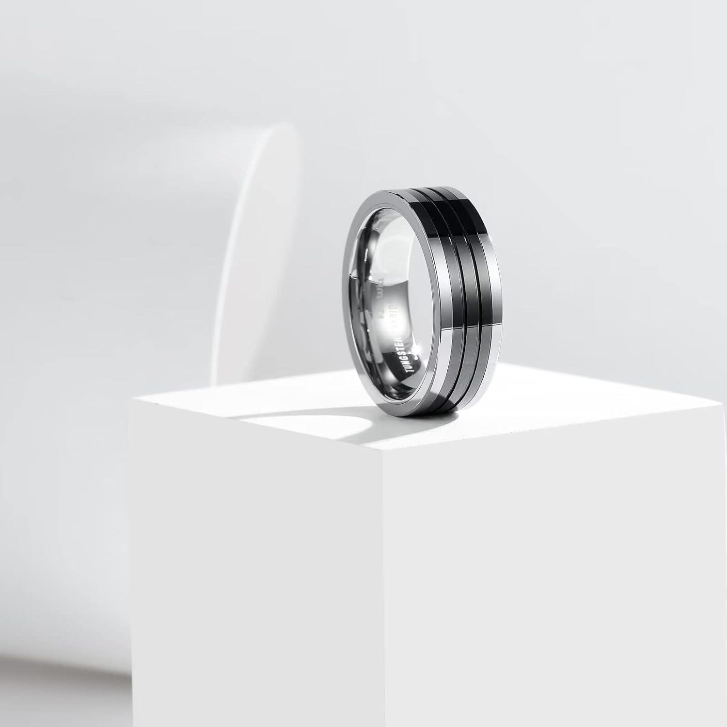 King Will 8mm Mens Silver Black Groove Tungsten Wedding Rings Black Groove Ceramic Center High Polished Surface Pipe Cut Edge Wedding Band for Men Women(silver-black)