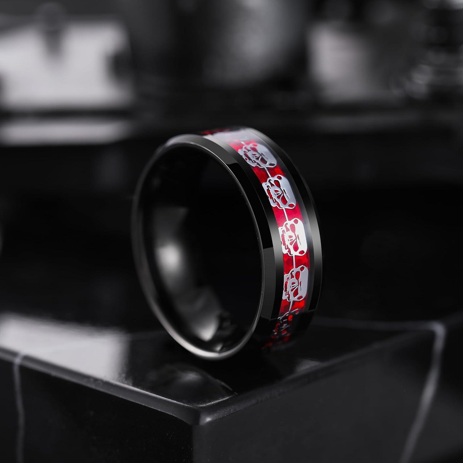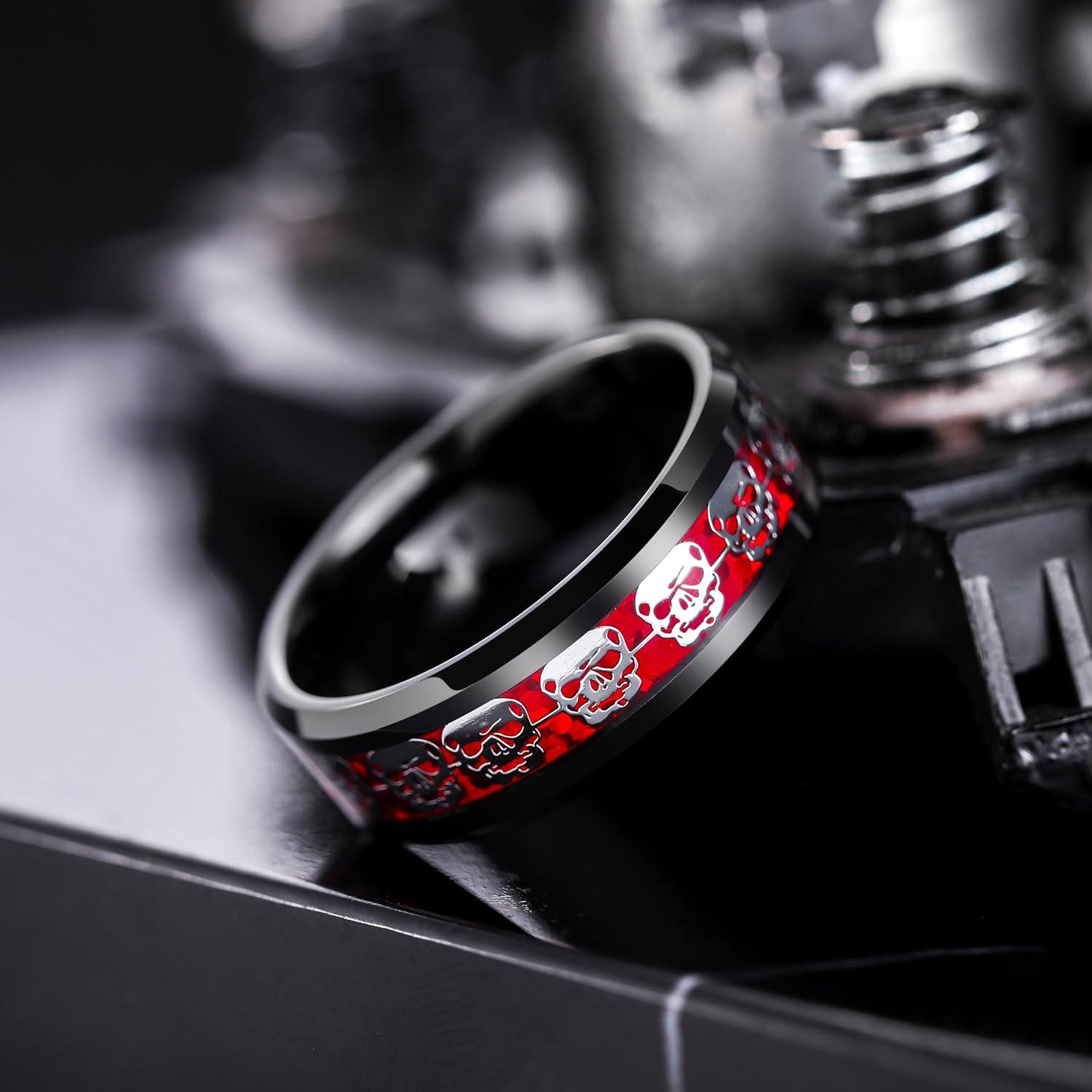 King Will 8mm Men’s Tungsten Wedding Band Masonic Compass Square Free Mason Ring/Irish Claddagh/Spider/Opal Sticker Inlay Skull Cashew Flower Gold Chain Silver Engagement Ring Beveled Polished Edge(Skull Opal Sticker Inlay-Red)