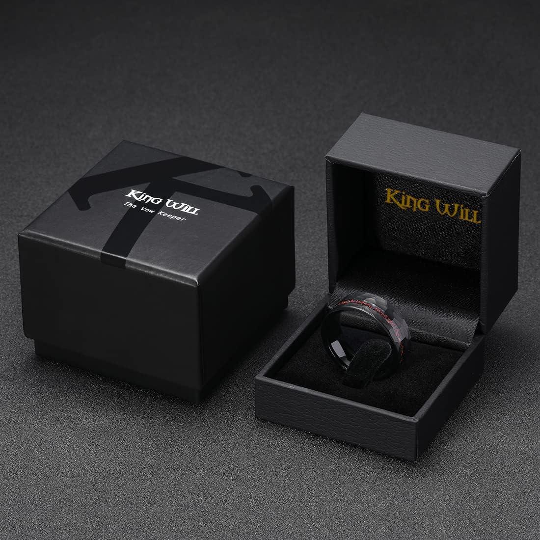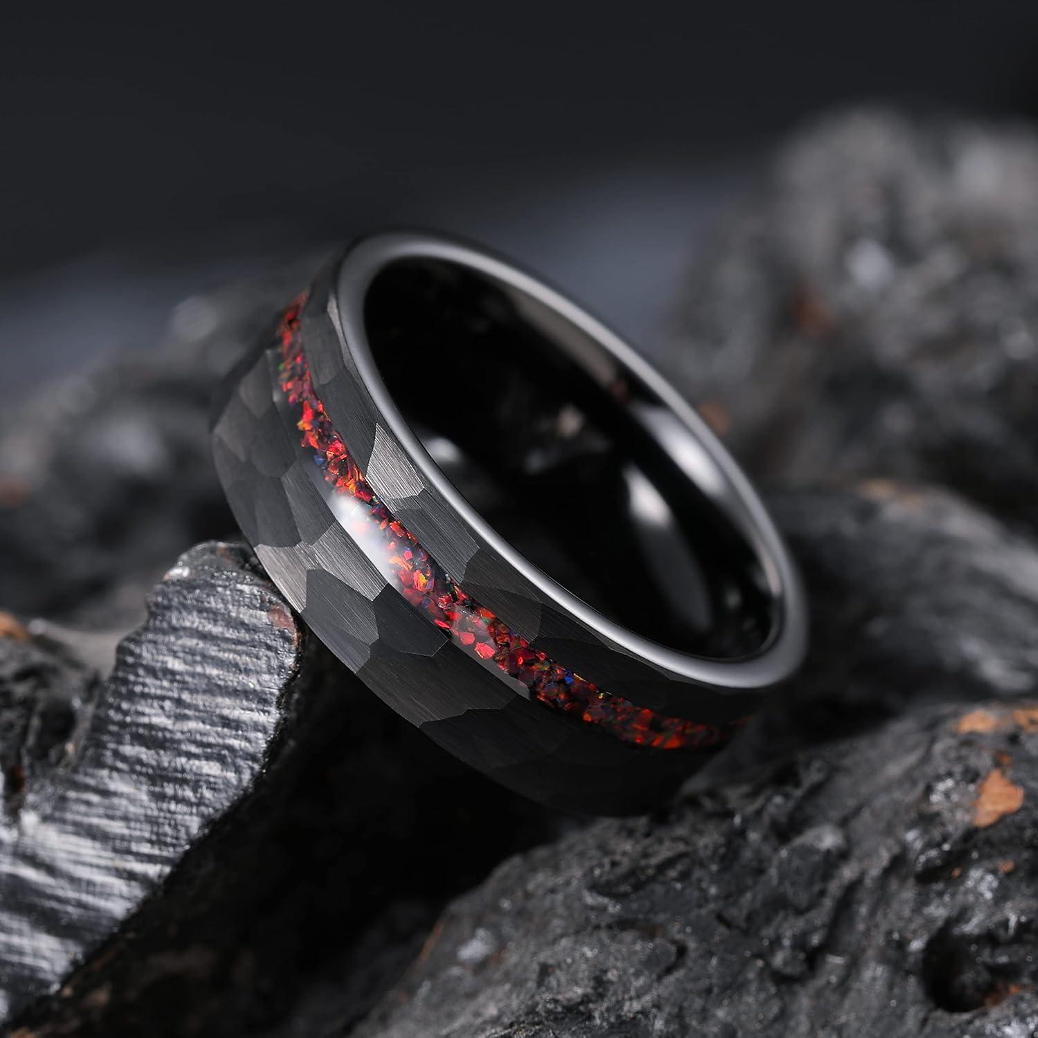 King Will 8mm Tungsten Carbide Opal Rings For Men Black Wedding Band Blue Opal Inlay Brushed Hammered Promise Rings Comfort Fit Size 7-14(Black&Red)