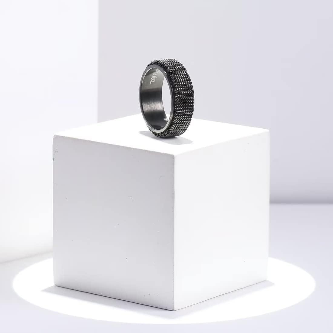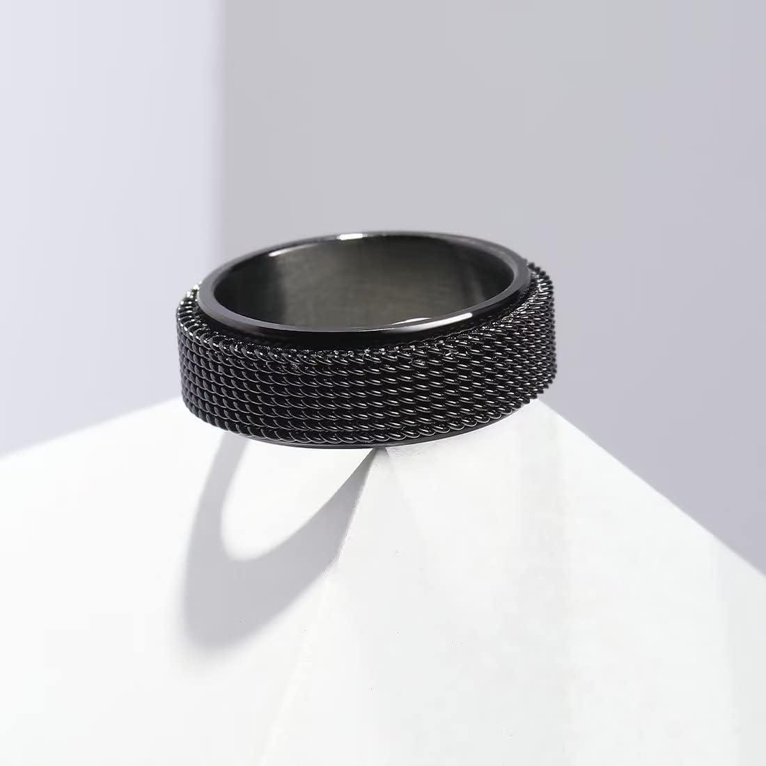 King Will Black Silver Gold Mens Spinner Anxiety Fidget Ring 8mm Stainless Steel Wire Mesh Chain Woven Mesh/Tire Stripe/Groove Ring for Stress Relieving(black Chain Mesh)