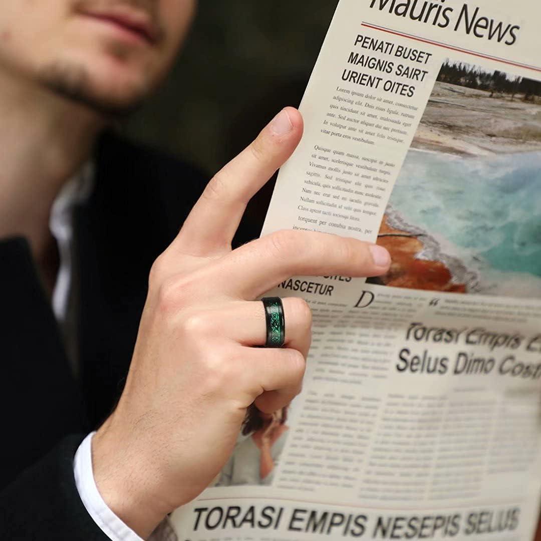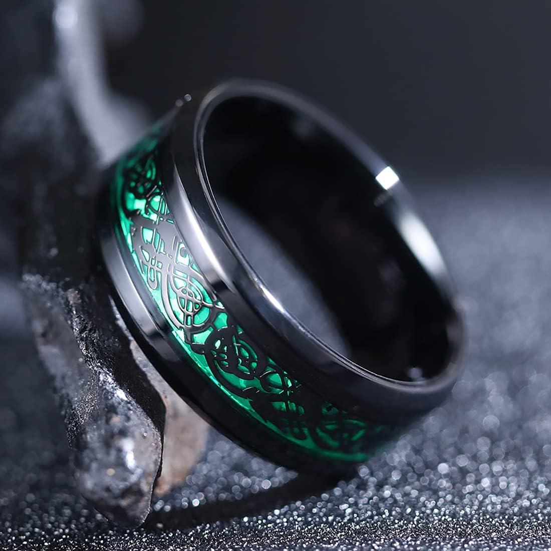 King Will DRAGON Mens Celtic Dragon Titanium Stainless Steel Ring Blue/Black/Green/Red Carbon Fibre Luminou Glow Celtic Dragon Titanium Stainless Steel Ring 7mm 8mm 9mm Zircon Polished Beveled Edge and Black Plated Wedding Band mens(green-9mm)