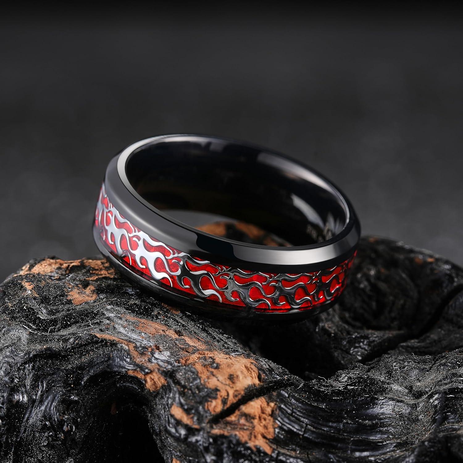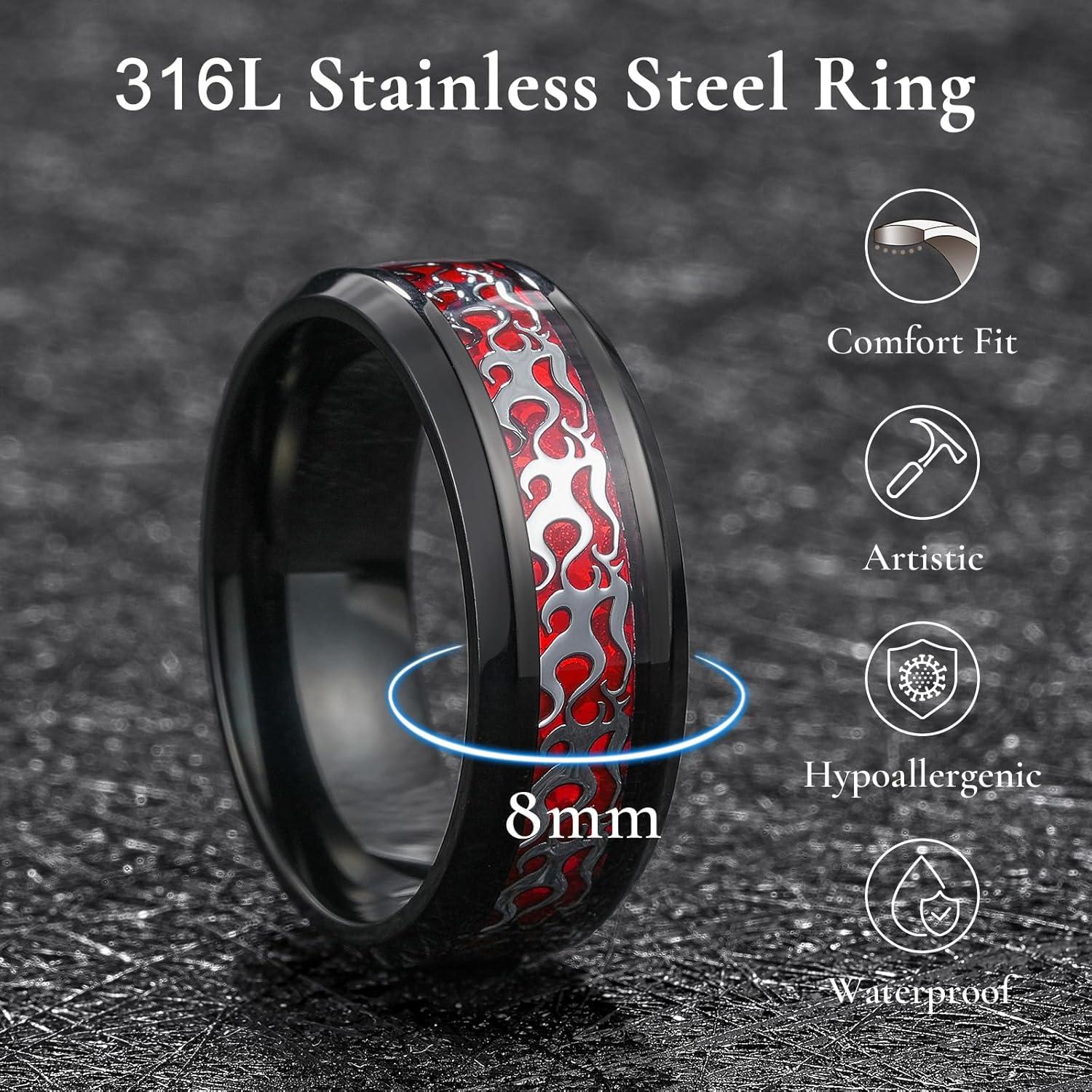 King Will DRAGON Mens Celtic Dragon Titanium Stainless Steel Ring Blue/Black/Green/Red Carbon Fibre Luminou Glow Celtic Dragon Titanium Stainless Steel Ring 7mm 8mm 9mm Zircon Polished Beveled Edge and Black Plated Wedding Band mens(Black-Fire-8mm)
