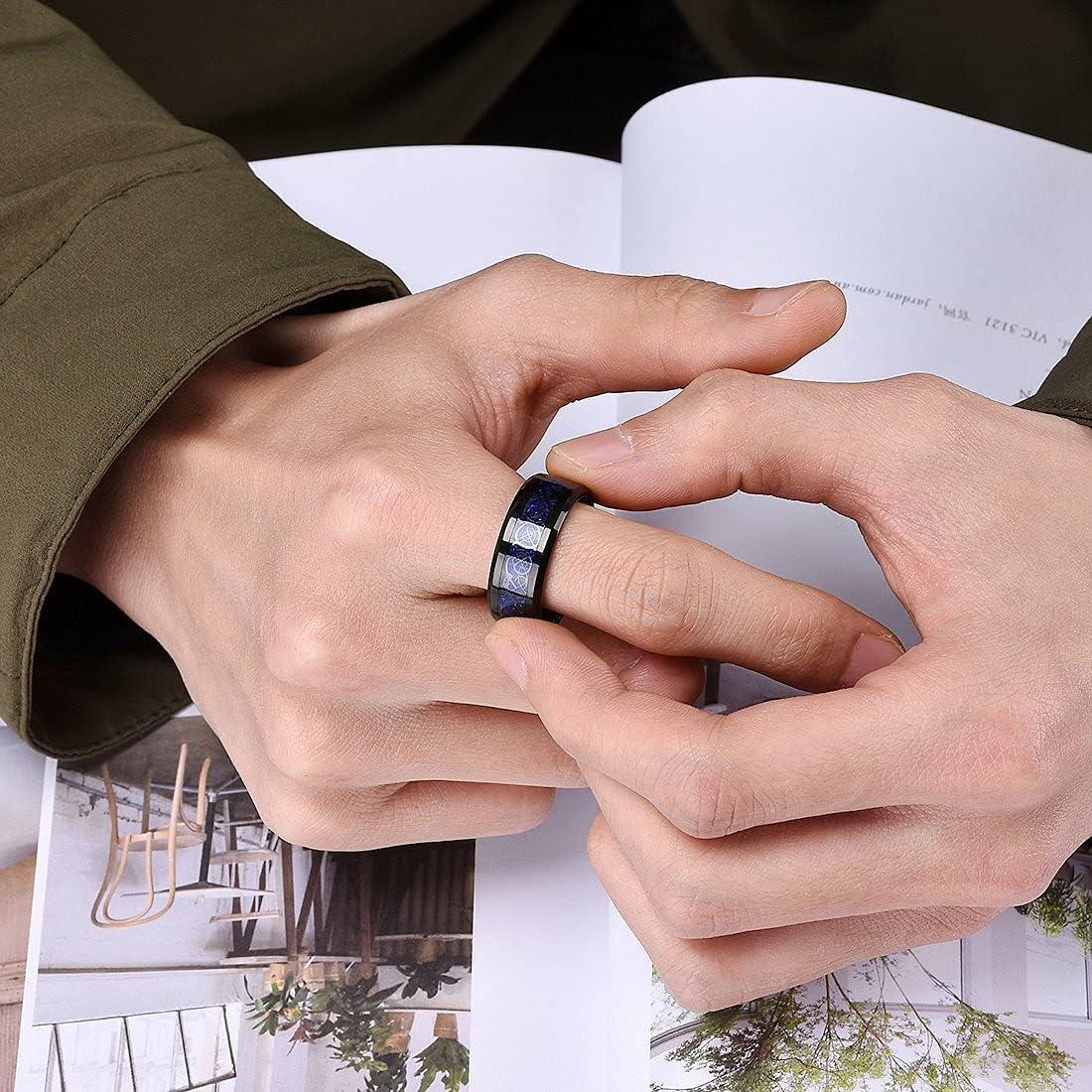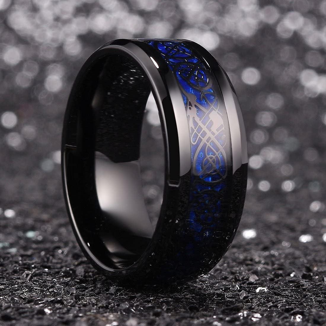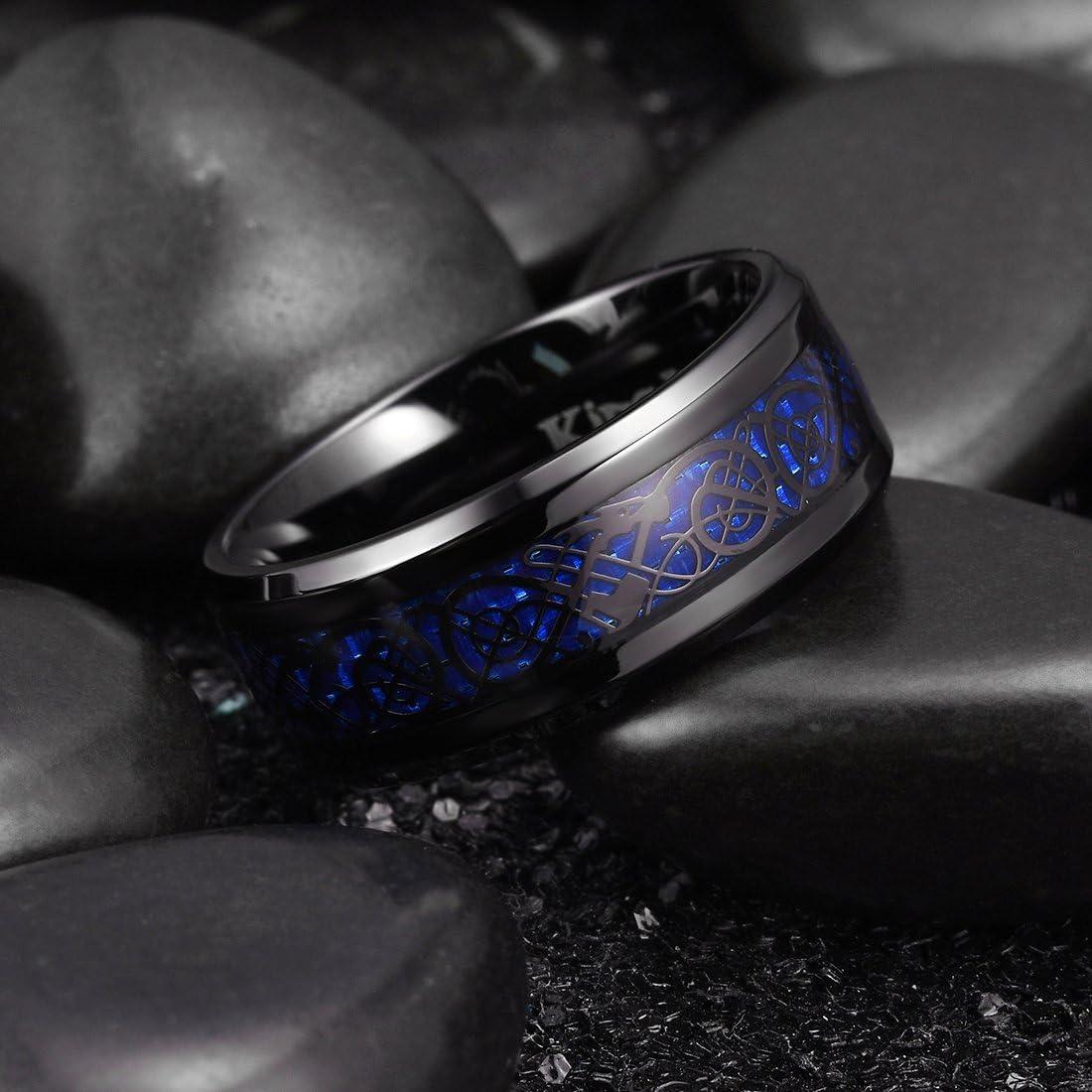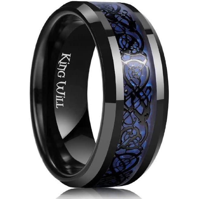 King Will DRAGON Mens Celtic Dragon Titanium Stainless Steel Ring Blue/Black/Green/Red Carbon Fibre Luminou Glow Celtic Dragon Titanium Stainless Steel Ring 7mm 8mm 9mm Zircon Polished Beveled Edge and Black Plated Wedding Band mens(deep blue-9mm)