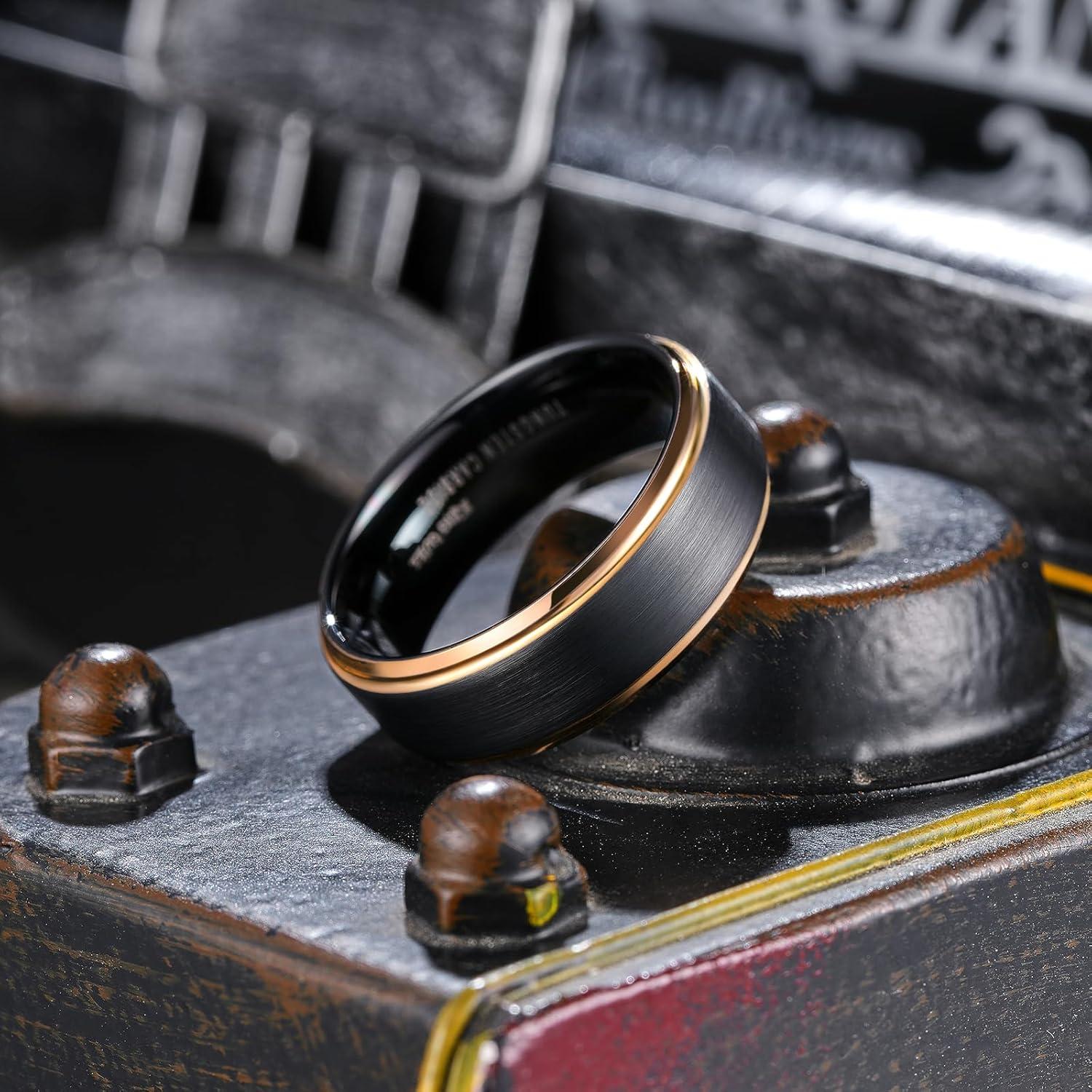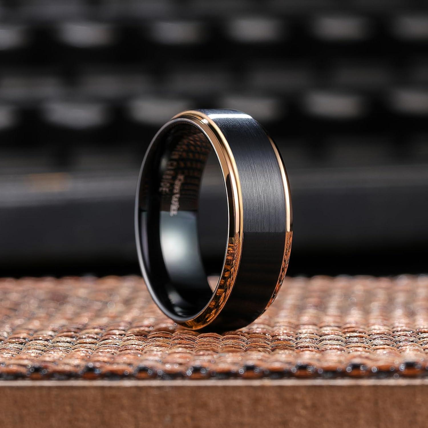 King Will Mens Brushed Wedding Band, Two Tone Matte Step Edges/Pipe Cut, Tungsten Carbide Anniversary Promise Rings Comfort Fit(Black&Rose Gold Edge-8mm)