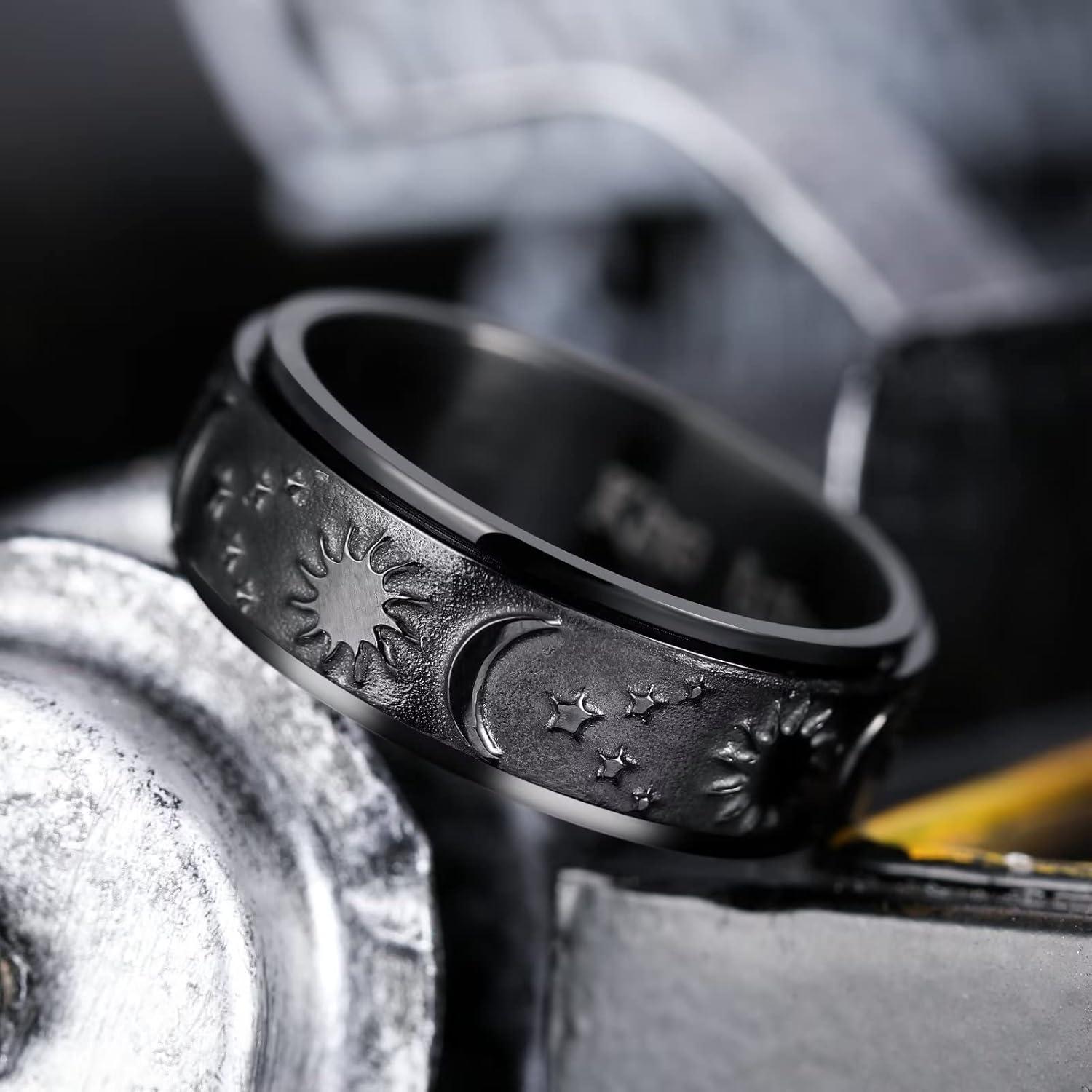 King Will Mens Fidget Ring Black/Gold/Rose Gold/Rainbow 8mm Stainless Steel Ring Spinner Ring For Men Women Stress Anxiety Relief Rotating Ring Finger Teens Toy Moon Sun Star/Triple Moon/Sand Blasted Comfort Fit For Unisex Adults(Black)