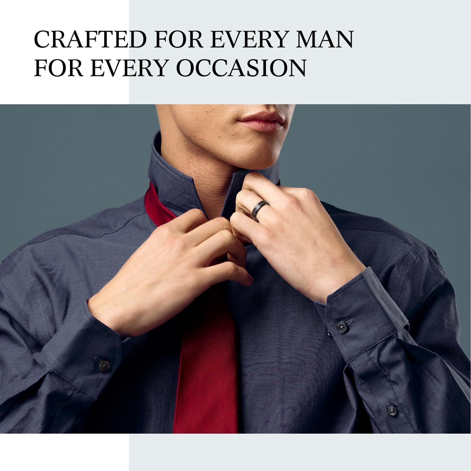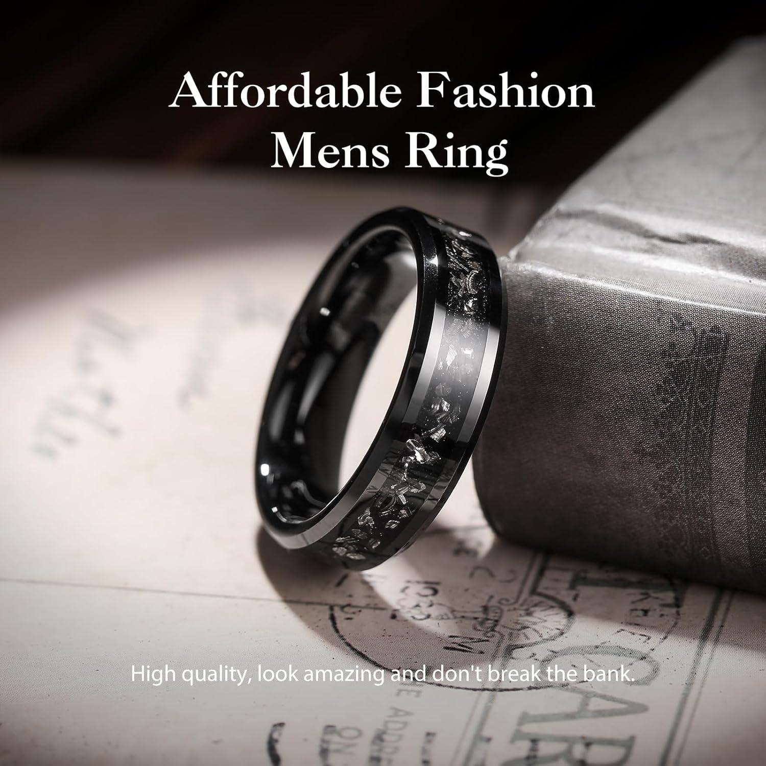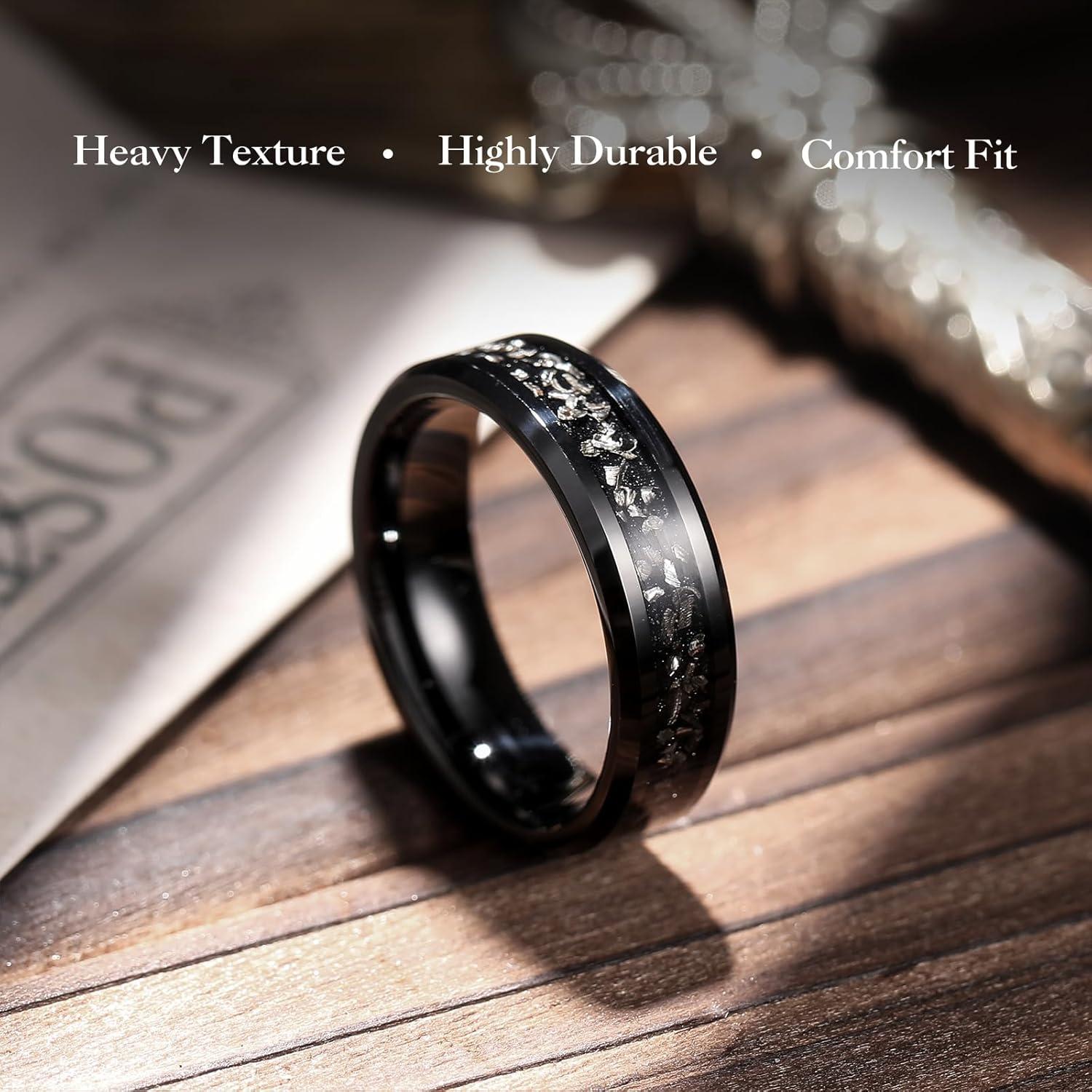 King Will Mens Meteorite Tungsten Wedding Bands, 6mm/8mm Width, Black/Silver Engagement Rings for Couples, Beveled Edge Promise Ring for Women Comfort Fit(Black-6mm)
