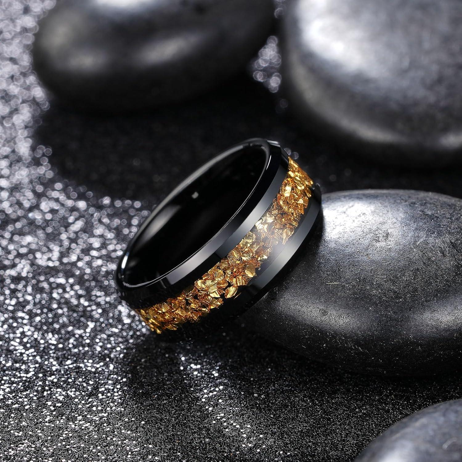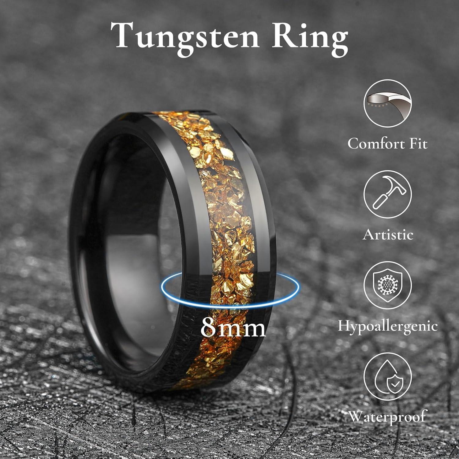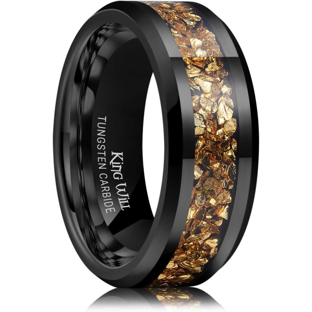 King Will Mens Meteorite Tungsten Wedding Bands, 6mm/8mm Width, Black/Silver Engagement Rings for Couples, Beveled Edge Promise Ring for Women Comfort Fit(Black&Gold-8mm)