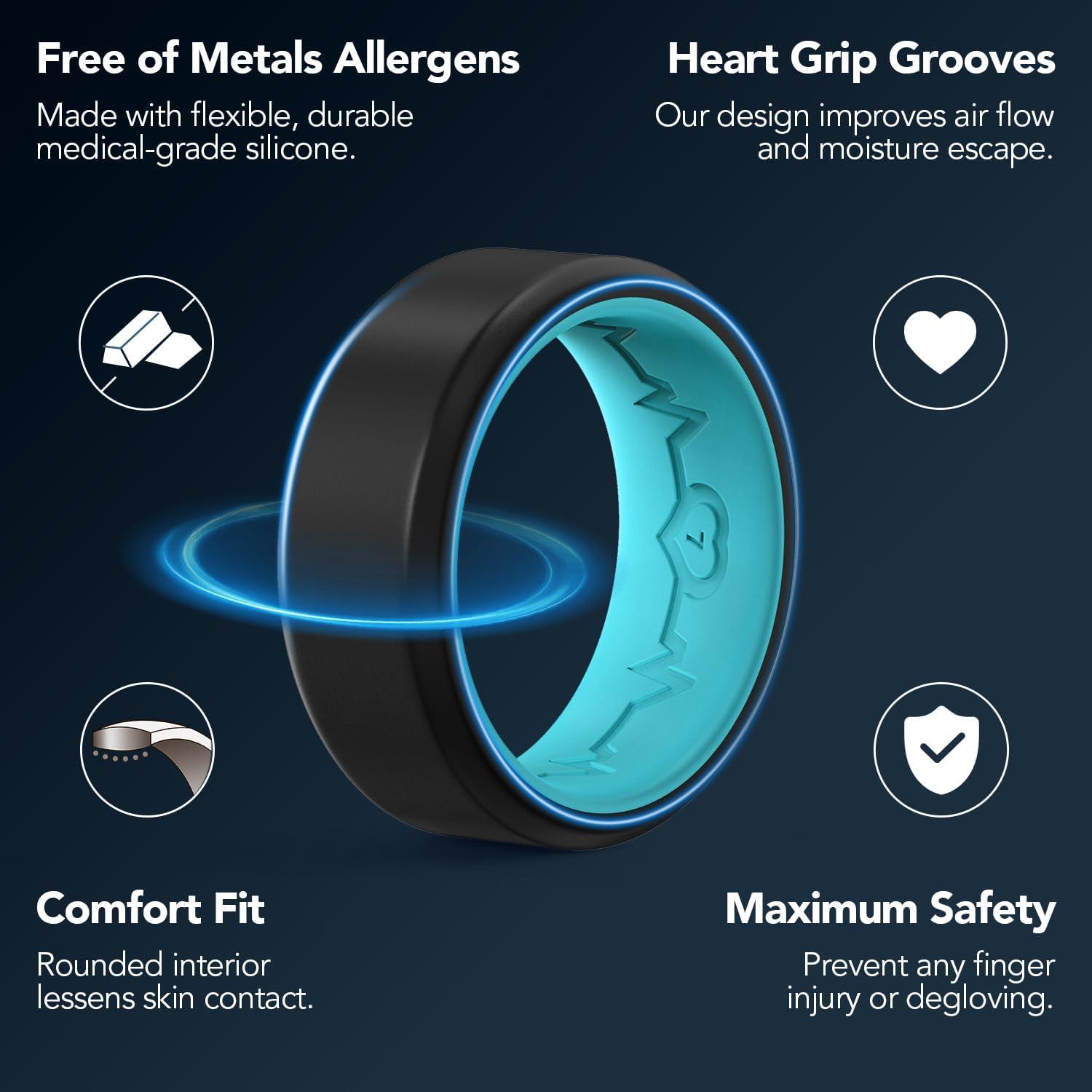 King Will Men’s Silicone Wedding Bands, 8mm Comfort Fit with Unique Inner Groove Design, Rubber Engagement Rings for Daily Wear and Activities – 1/4 Variety Multipack(Black&Mint Blue)