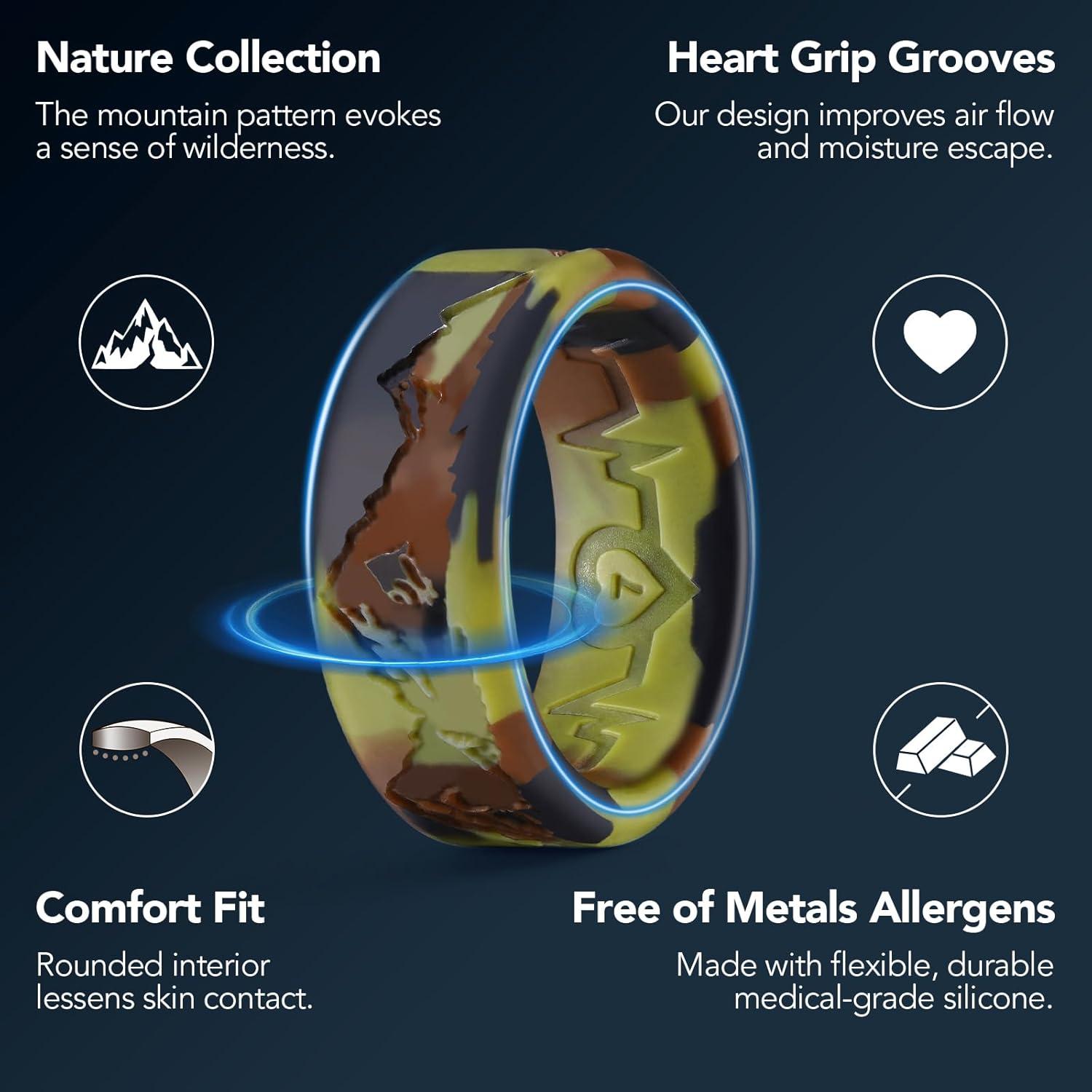 King Will Mens Silicone Wedding Rings, Green Camouflage Rubber Wedding Bands with Unique Mountain Peak Design, 8mm Wide 2.2mm Thick, Comfort Fit Size 11