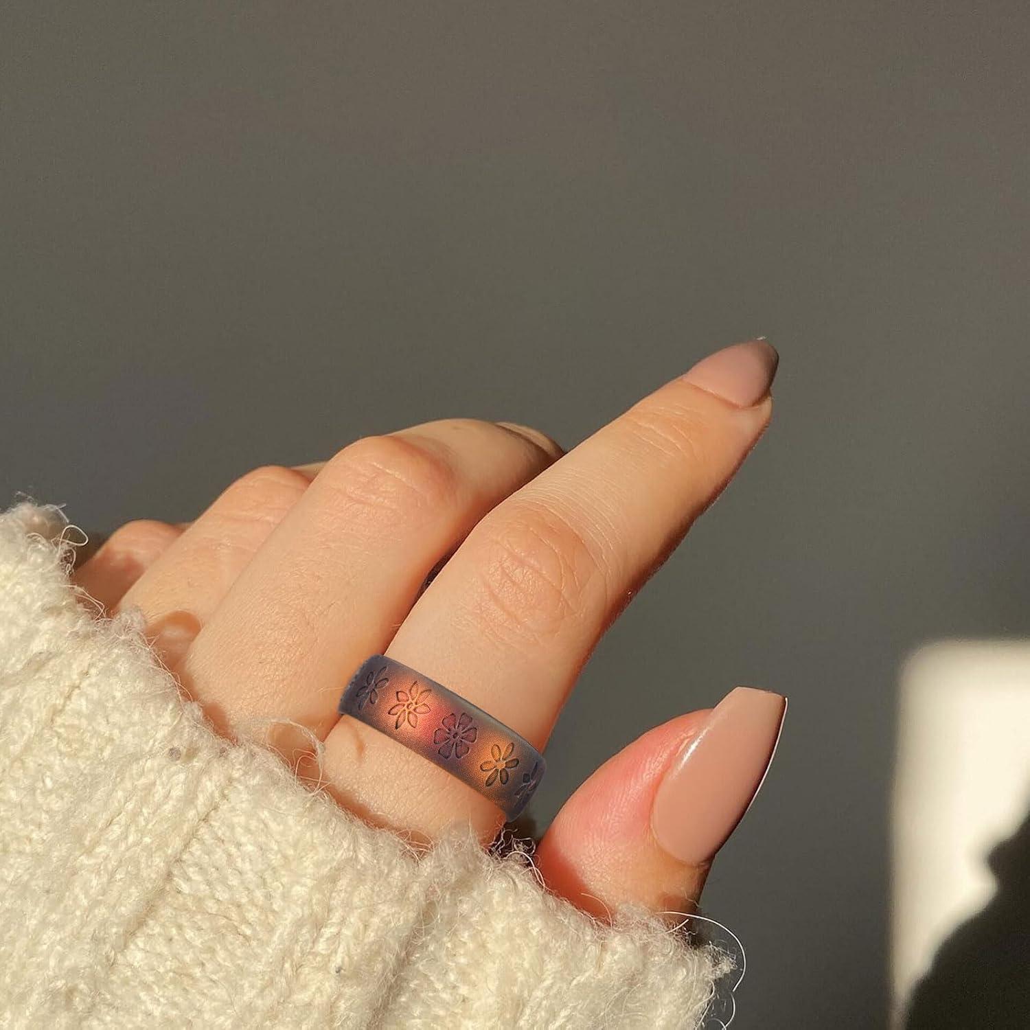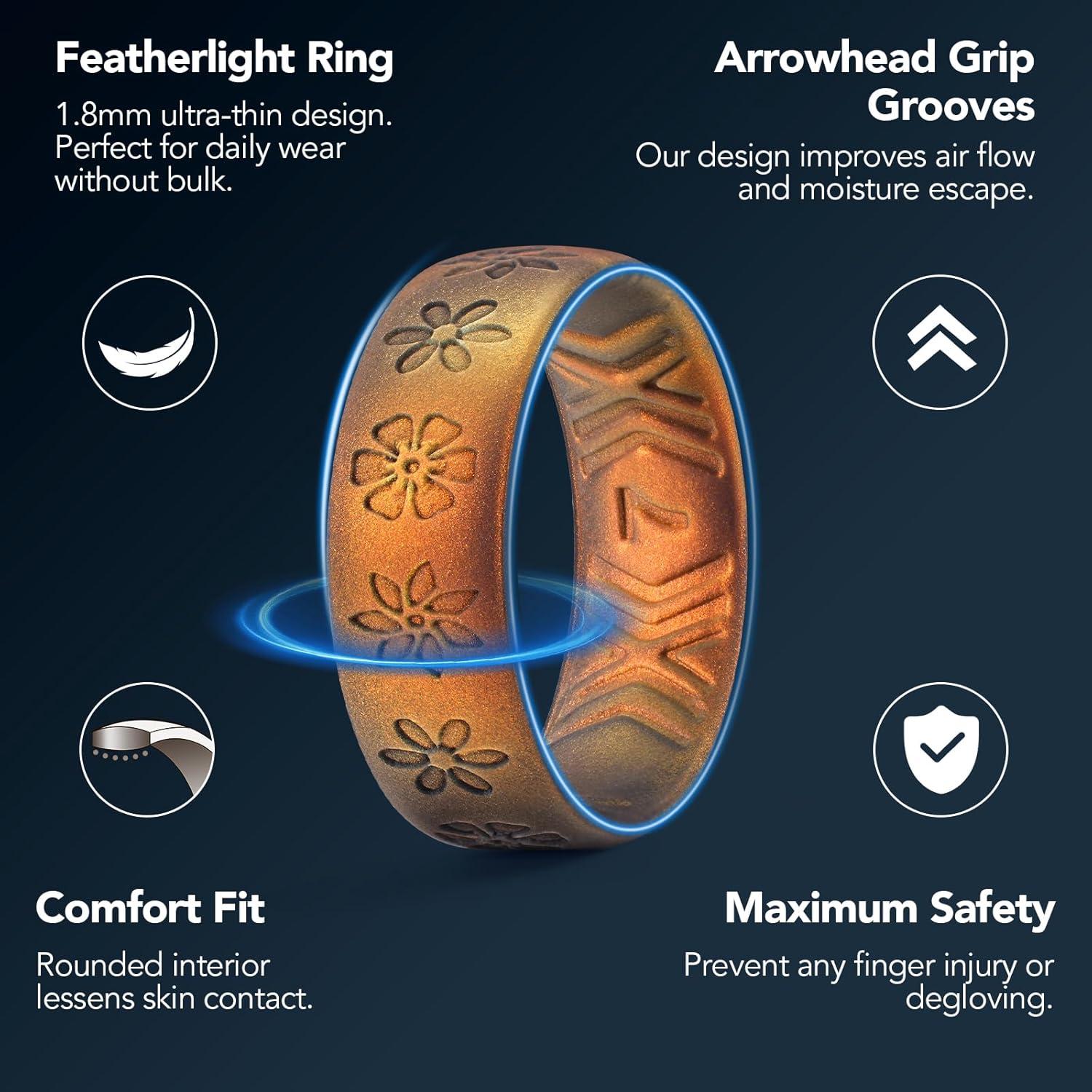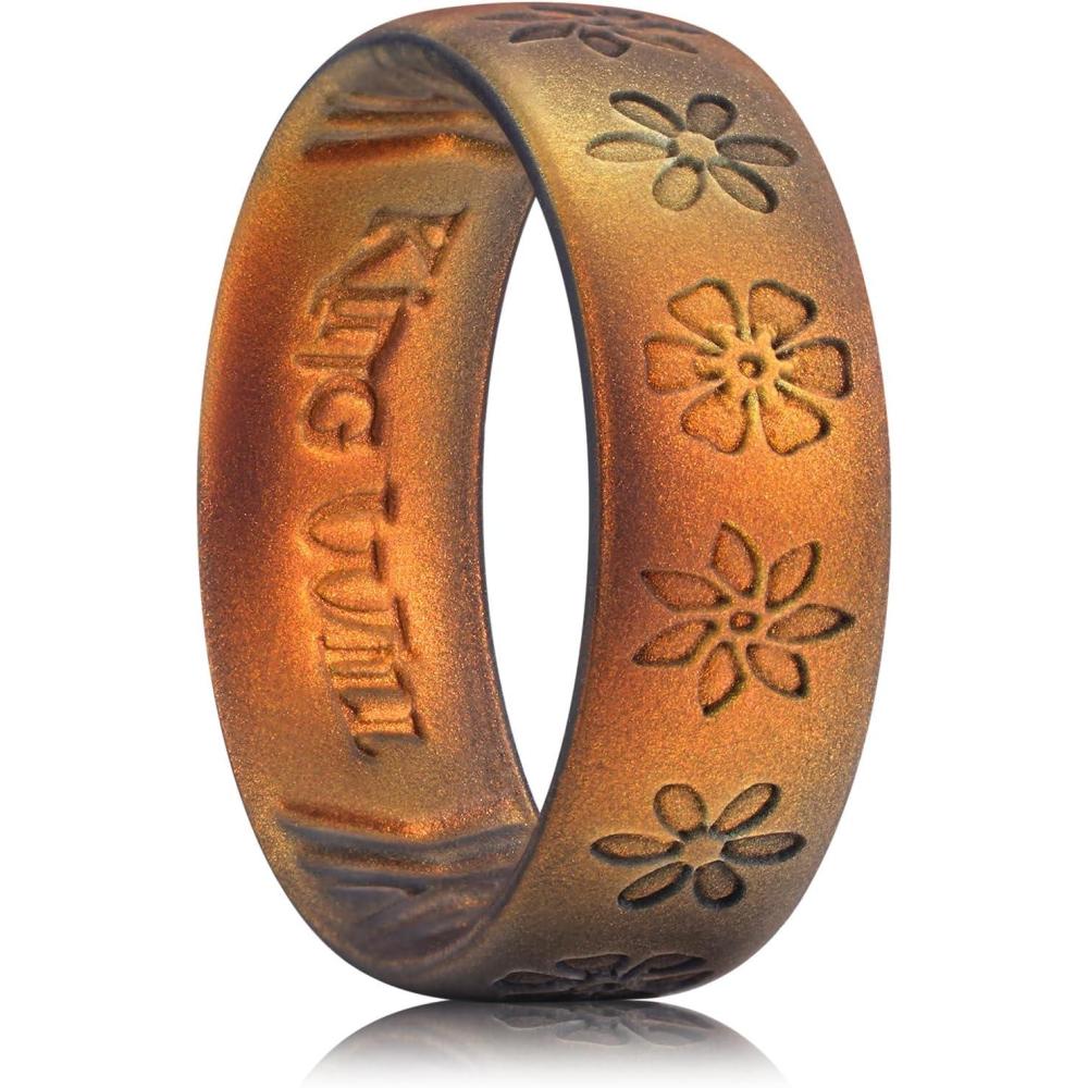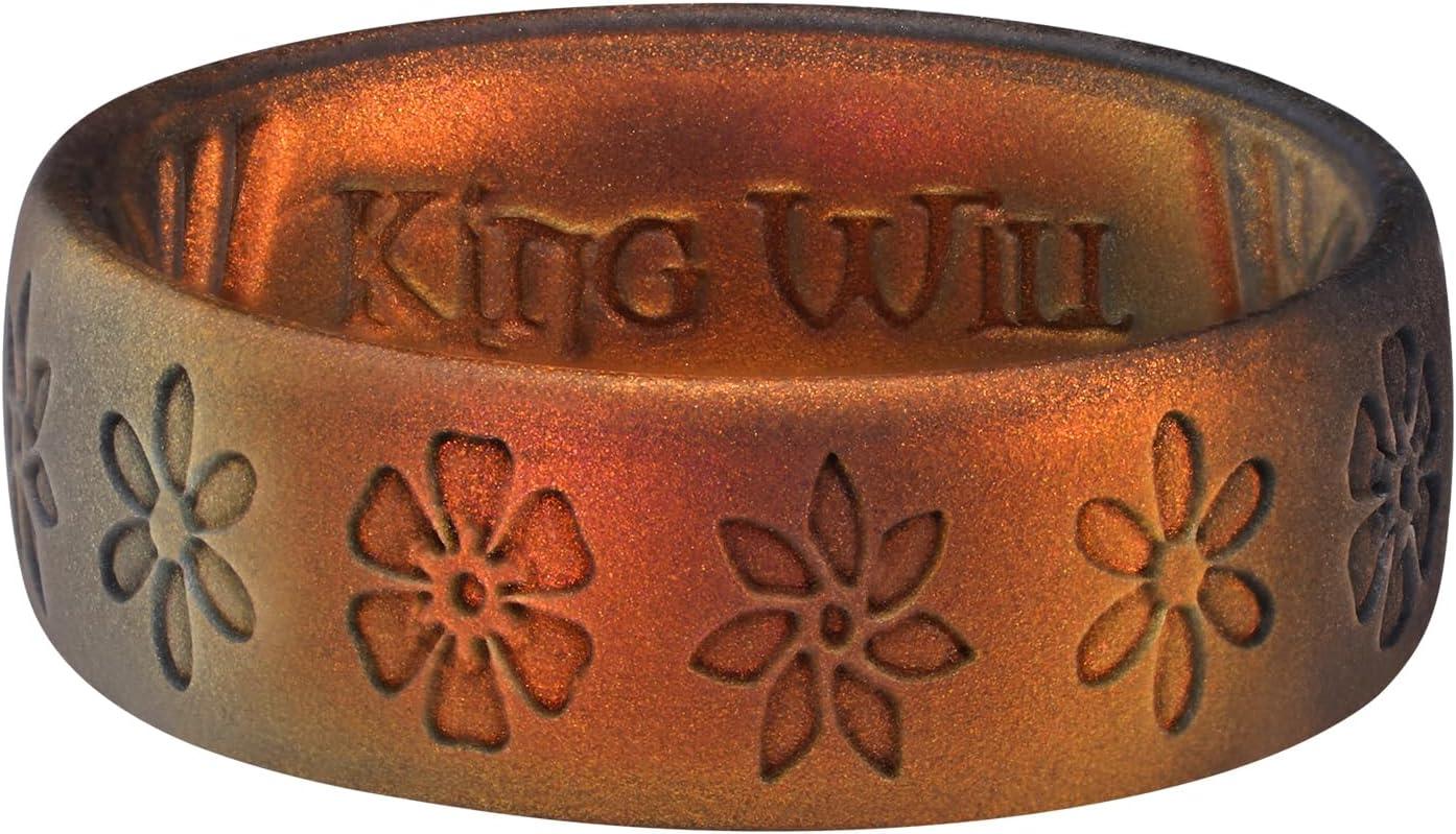 King Will Mens Silicone Wedding Rings Star/Flower Pattern Rubber Wedding Bands(C-Sunset orange)