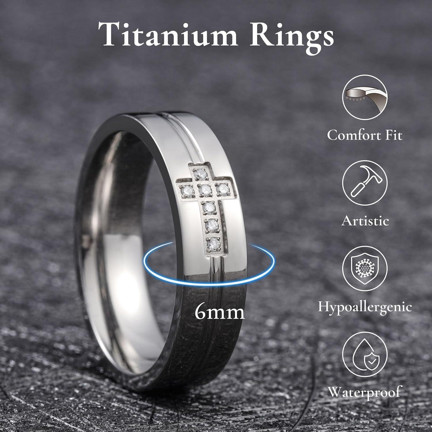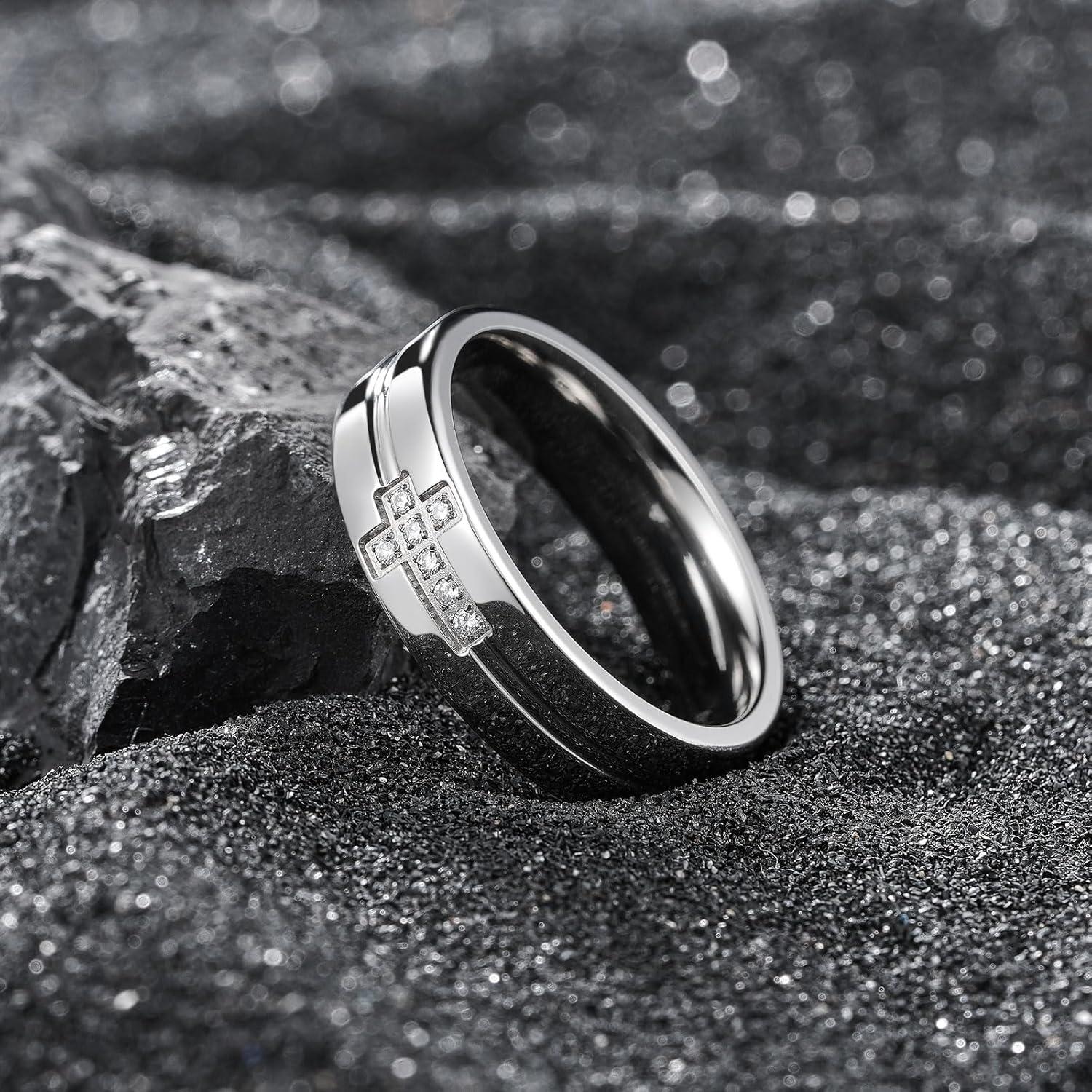 King Will Men’s Titanium Wedding Band – 8mm Polished Band with Step Edges and Cross Design Featuring White Zirconia Insets Comfort Fit Size 7-14(Silver-White-6mm)