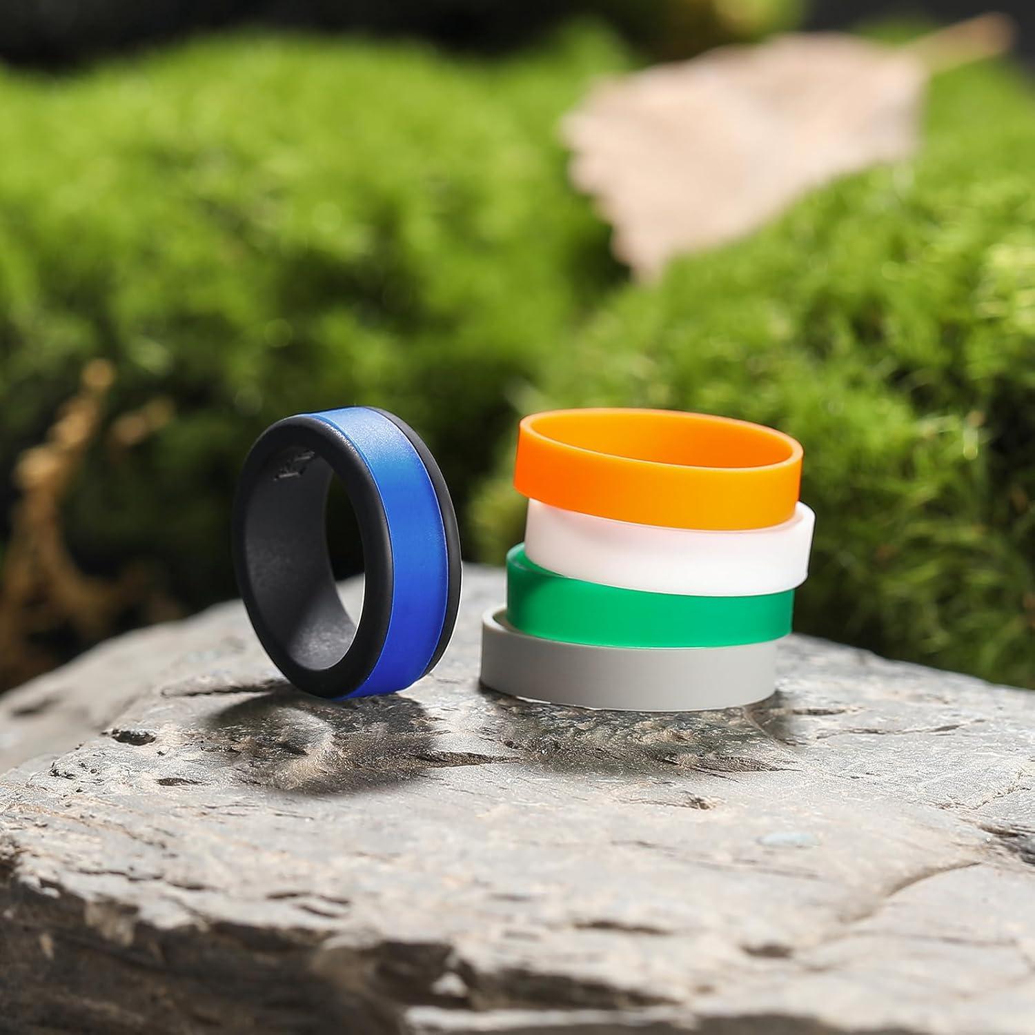 King Will Silicone Ring for Men – Gray Mens Silicone Wedding Band with Gray Blue Green Orange Variety Colors Flexible Changeable Stripe Bands – 8mm Wide Rubber Wedding Bands Engagement Ring(1Grey Bacis+5 Color Stripe Bands)