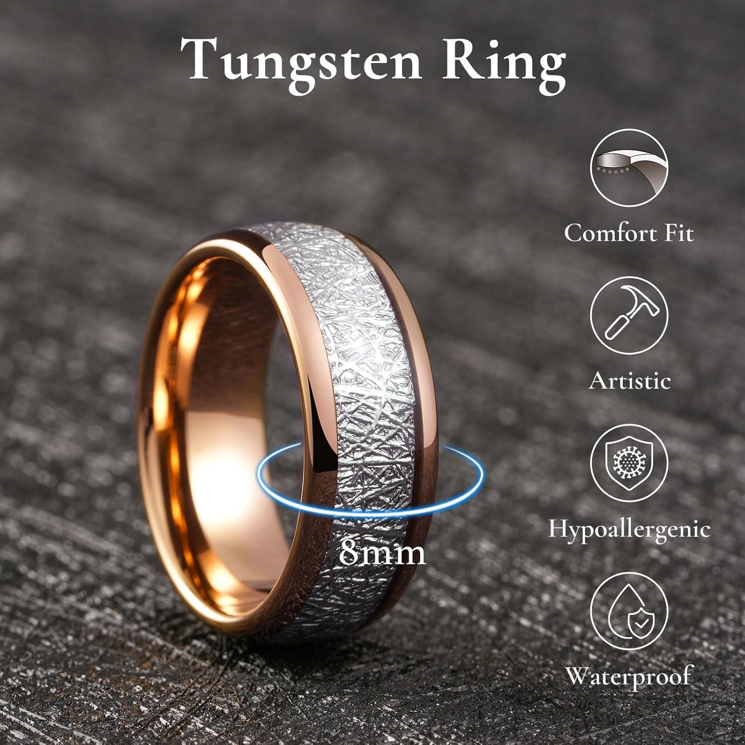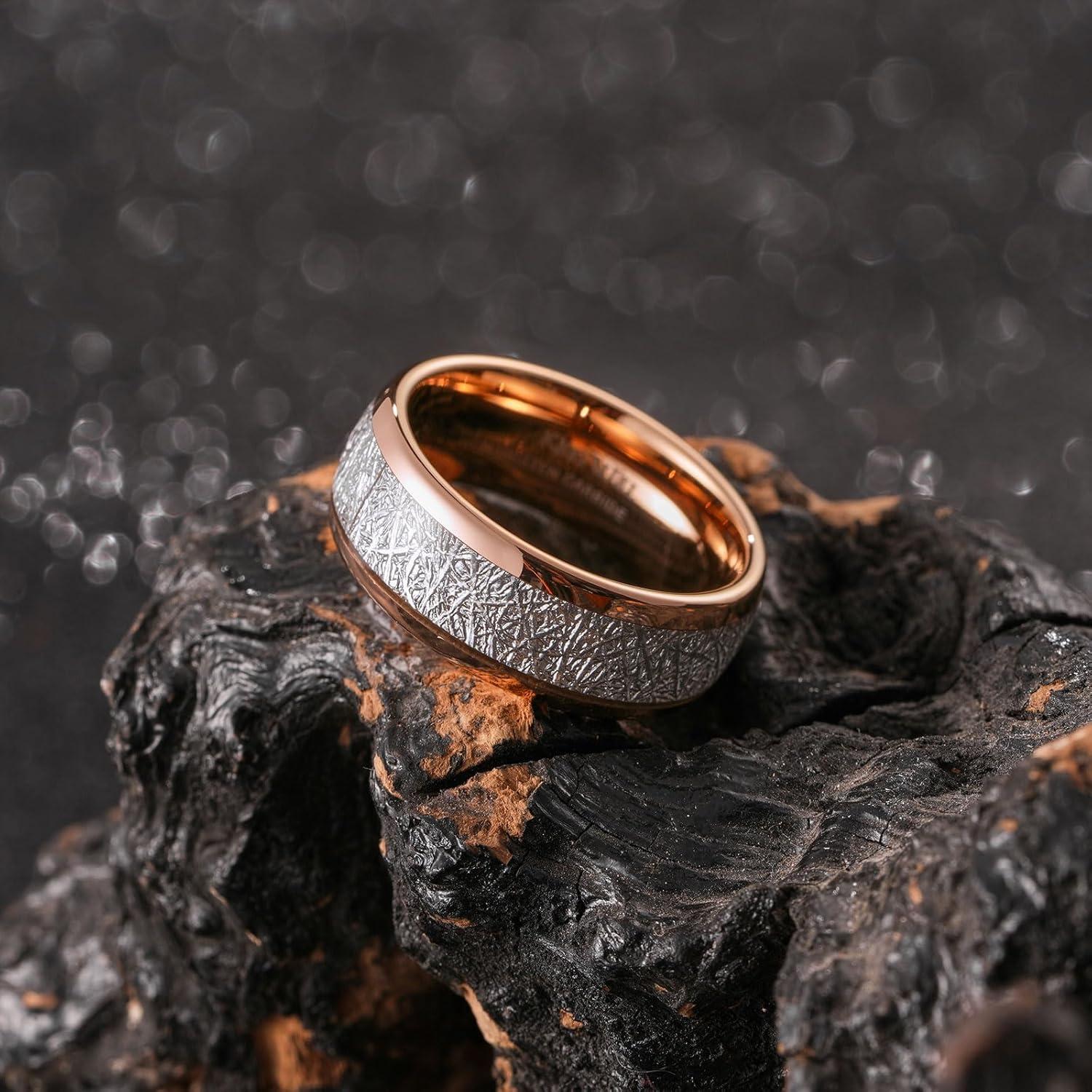 King Will Tungsten Rings for Men Meteorite Carbon Fiber Wood Inlay Mens Wedding Engagement Band Domed Polished(8mm Rose Gold & Silver)