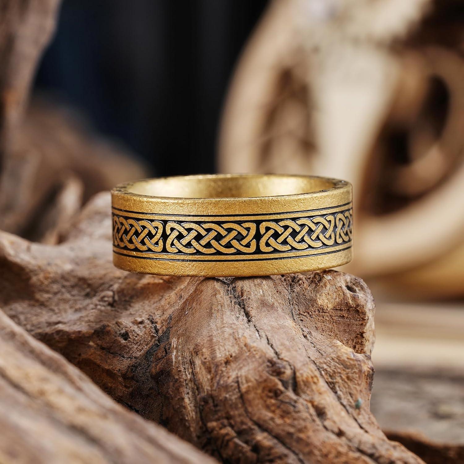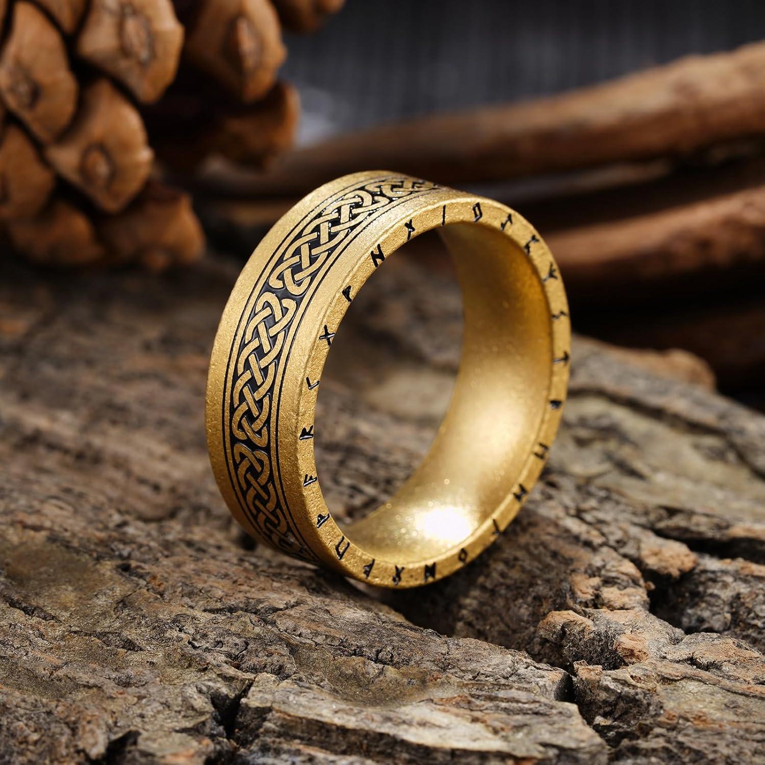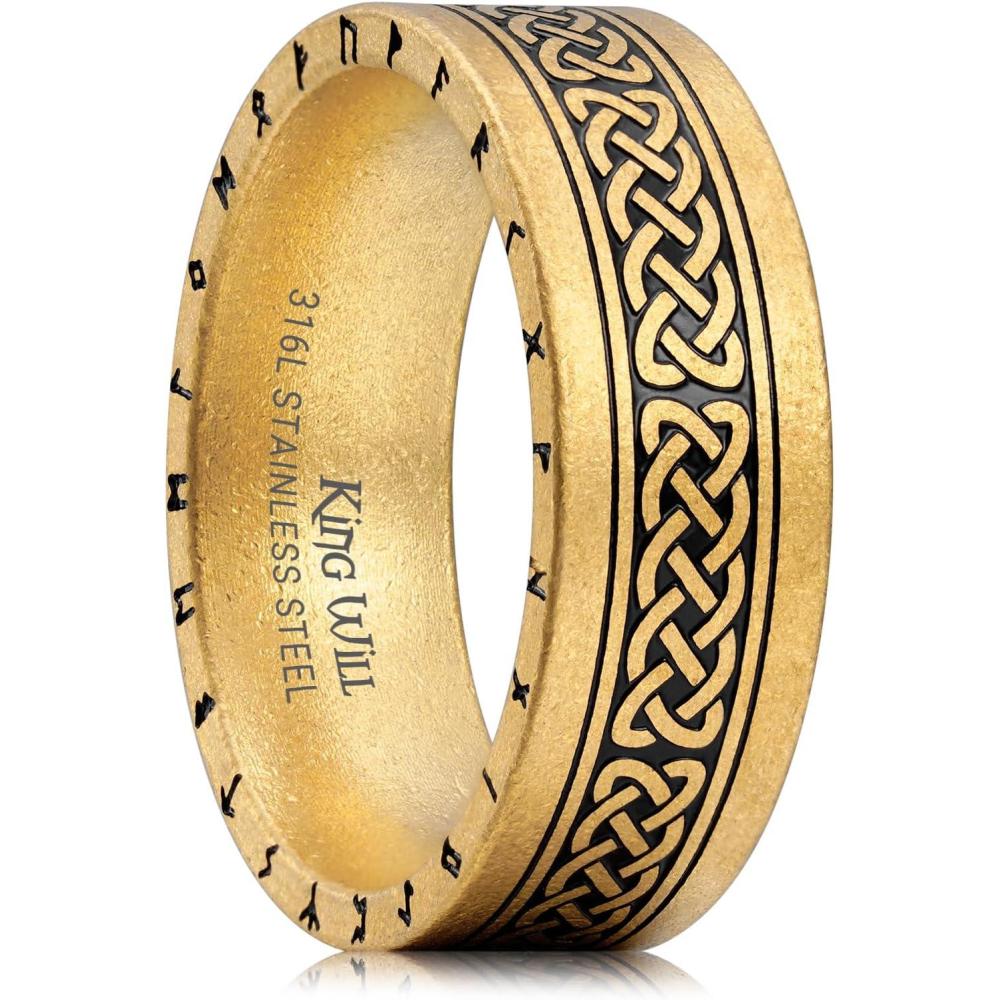 King Will Viking Stainless Steel Wedding Band – 8mm Men Ring with Tree of Life Rune Design and Abalone Shell Inlay in Grey/Gold/Black Vintage Finish,Comfort Fit Size 7-14(Gold-Runes-B)