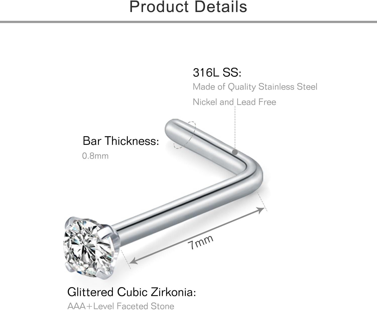Mayhoop 20G Nose Rings Studs 316L Surgical Stainless Steel L Shape Bone Diamond Heart Corkscrew Nose Ring Nostril Piercing Jewelry For Women Men(L-Silver-C)